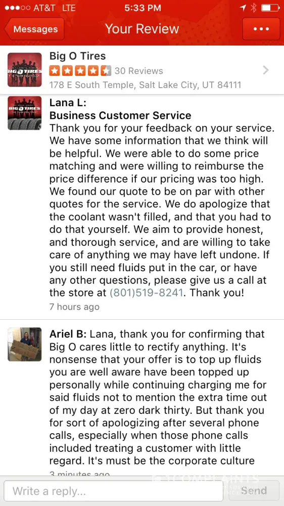 That night I contacted Big-0 corporate by filling out the online customer service form and requesting contact about the issue. Seven days later with still no contact from anyone at Big-O, I called the National Customer Service line and filled a complaint with a representative and was told that I would be contacted within 48-72hrs.