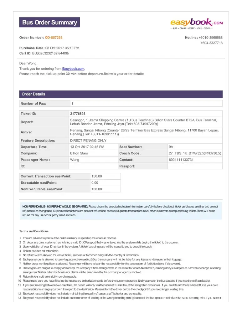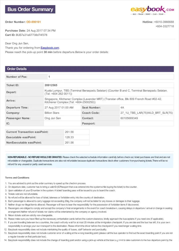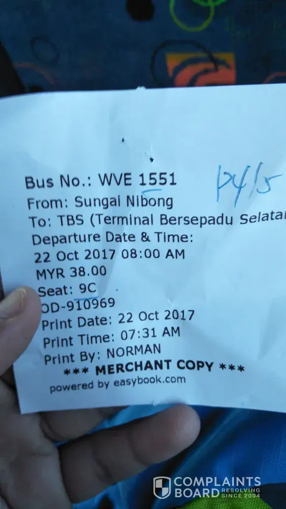 On 26 August 2017, I booked two tickets from easybook.com from TBS-KL to Singapore (Beach Road) at 3.30am depart for RM55/seat. The bus was late 20 minutes and arrives at 3.50. (We got onto AGW 6855 bus) Then the driver stopped at sungai Besi PLUS highway stop for 30 minutes then resume journey. I could not sleep at all due to SMELLY interior and very dirty seats. The recliner broke so I was forced to remain sit straight until Singapore. The aircond vent almost fell off and the lights mostly not working. How can you operate a long-haul coach like this? Then the bus stopped again at Yong Peng another 30 minutes. Then they stopped at Larkin-JB to drop passenger and by 9.15 reach Malaysian custom. By 9.40 we reached Woodlands. The clearing customs at Woodland was late therefore when we got down at 10.00am, the bus already LEFT US. Imagine you are first time travelling in another country and then missed by the bus? It was such a panic moment. I was not the only passanger. There are 3 more passengers left out. Two of them are international passenger. We in a group found out way to the city ourselves. This is unacceptable. The fare was paid to send me to Beach road, instead we took another bus to get there. I demand my money back. The journey was not completed. Please call me [protected] or reply through my email [protected]@gmail.com to respond to this case.