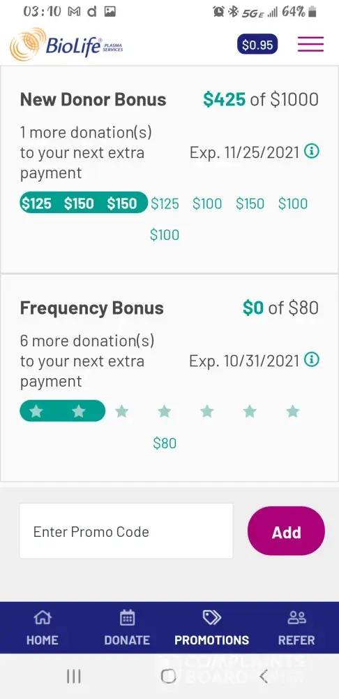 I went into Biolife on 9/26/21, new donor. I was referred, by a friend, which I gave her name. I also had a promo code for $1200 for new donors. showed it to the nurse. After donation, I spoke with a manager, because my promo didnt show. It says $1000 instead of 1200. I showed her my promo code again, and she assured me she fixed it.