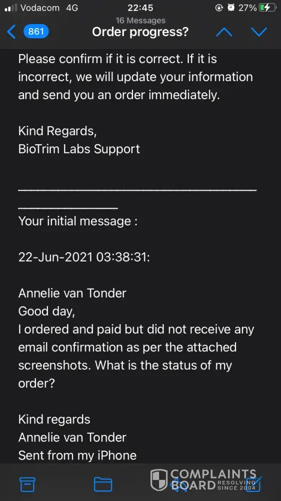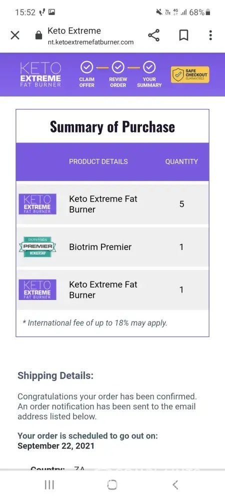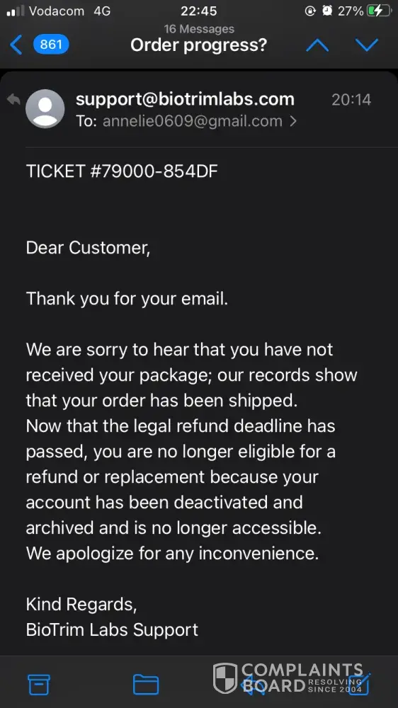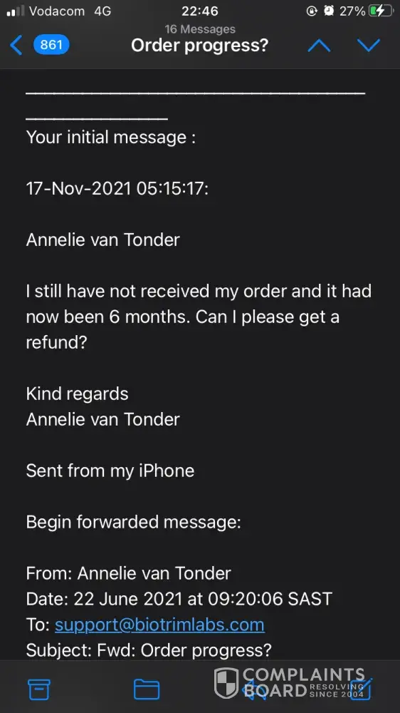 I have order the following on 19.09.2021. I received an e-mail on 03.11.2021 that my order is on its way with a delivery number ASL20210920ZA5473077 stating that delivery usually takes 14 -21 days, by due to high demand delivery may take 3 - 6 weeks. Needless to say I have paid the full amount of R4.308-00 and my order was the following: 6 Keto Extreme Fat Burner and 1 Biotrim Premier and I received confirmation that my order will be shipping on 22.09.2021. More than 6 weeks have passed and I don't received proper feedback as to where my order is. I only received 1 bottle extreme fat burner. I must say I will not recommend this product even if it's working because the response and service I received is pathetic. I have forward about 7 e-mails to [protected]@BioTrimLabs.com by not feedback. Can you please refund me because nobody will accept this poor service.
