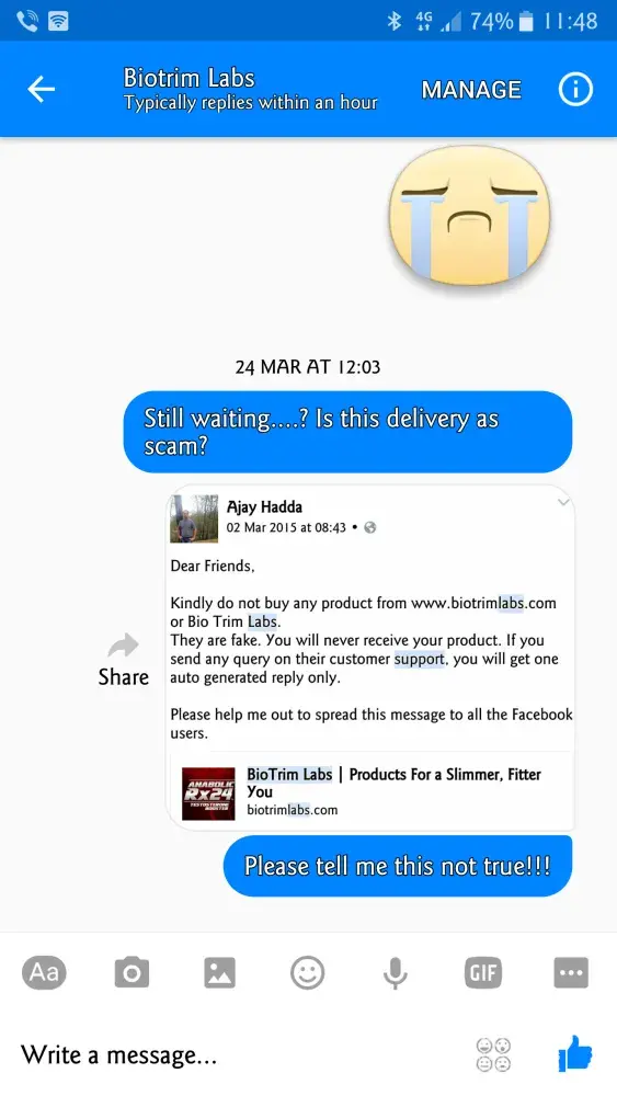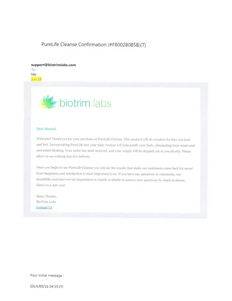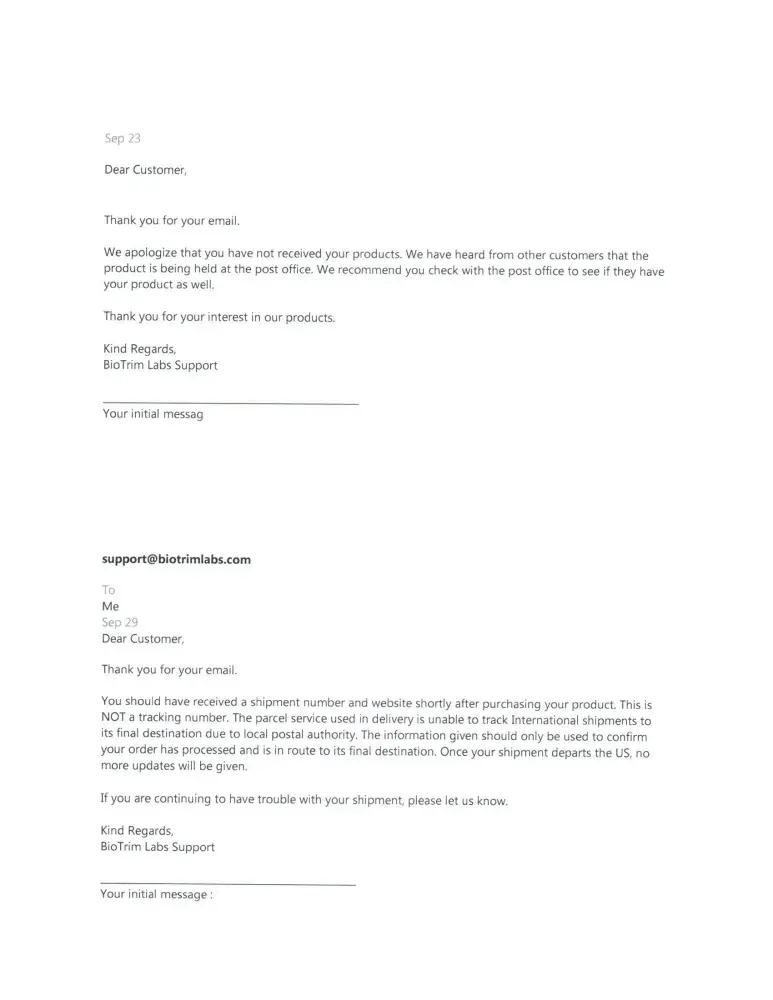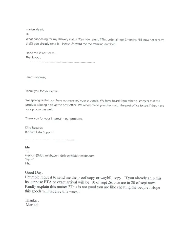 6. I wrote on the same day to [protected]@biotrimlabs.com for a refund and got an auto reply that a representative will contact me within 48 hours. No one did.