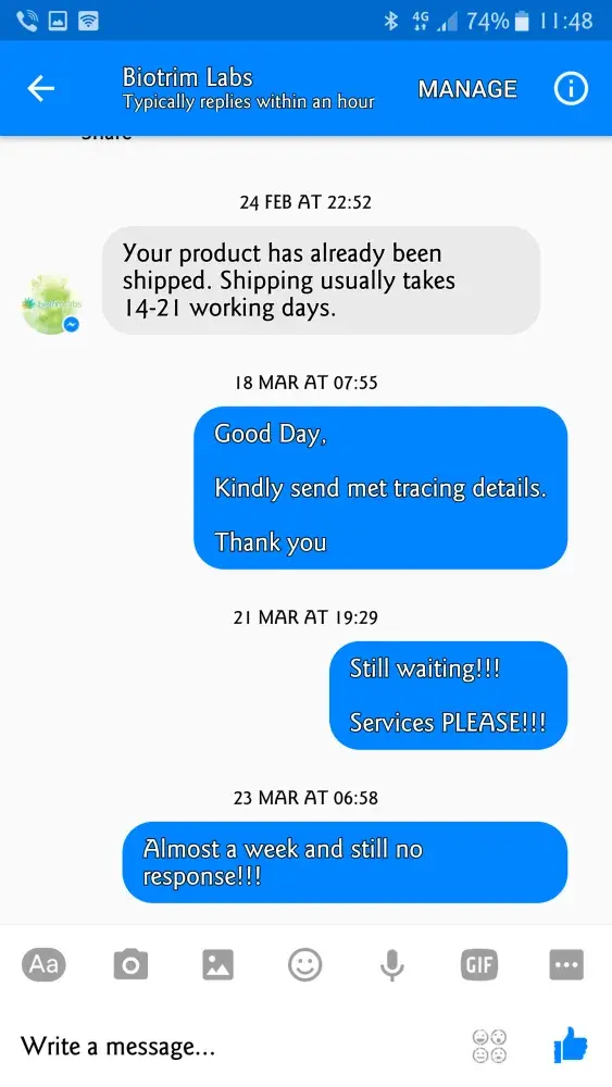 Received confirmation on the 24th Feb it's been shipped and ever since nothing has arrived OR no one reply from Bio Trim for a tracking number!