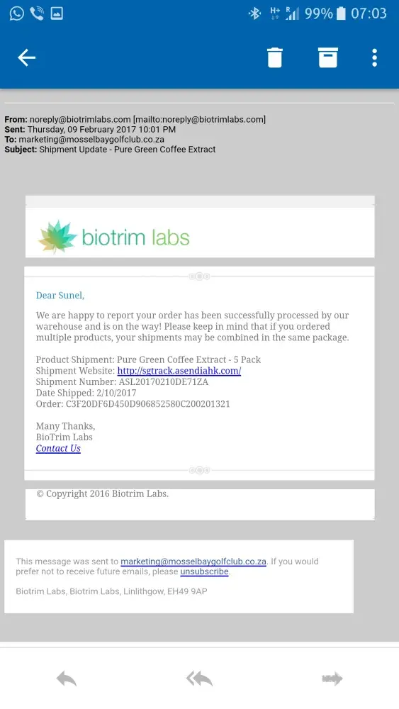 4. The response to congratulate me on my purchase came via a third party gateway i.e. [protected]@biotrimlabs.com via sendgrid.me