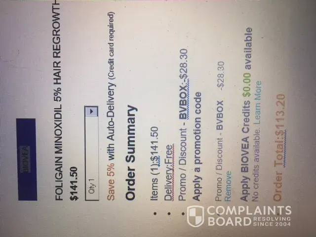 Your reply to my comments on improper charges contradicts true facts. In my purchase order, I have applied the promotion code BVBOX (20% off) to purchase FOLIGAIN minoxidil. The discounted price of $113.20 was displayed on my purchase order (the copy and photo of this order was faxed to Visa to challenge this transaction), however my credit card was charged $141. 50. My case shows very clearly how BIOVEA applies dishonest practices in selling its products - note that I would not proceed with buying the FOLIGAI since the price of $141.50 is too high compared to other suppliers.