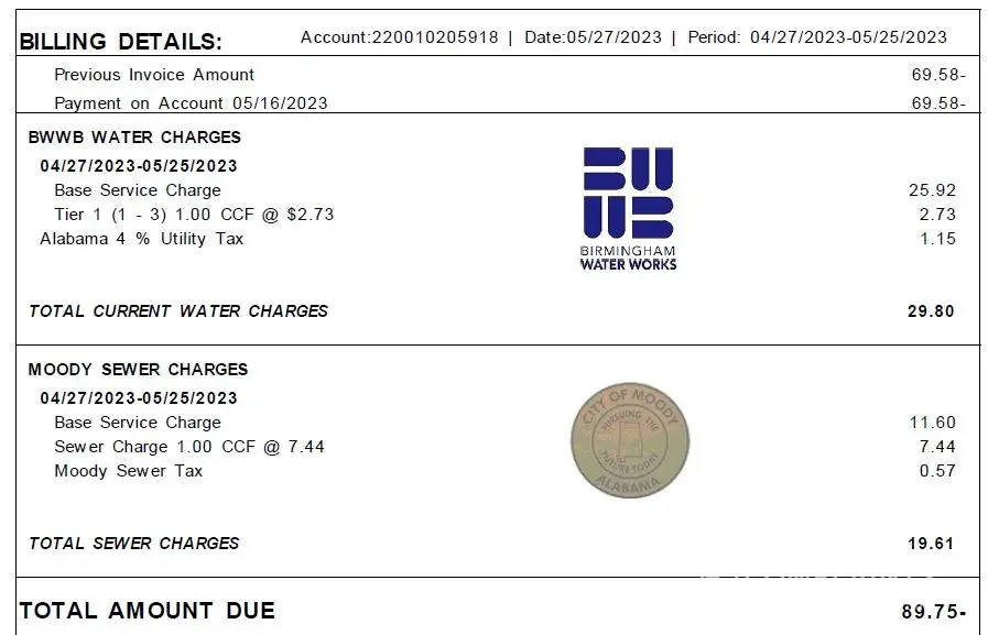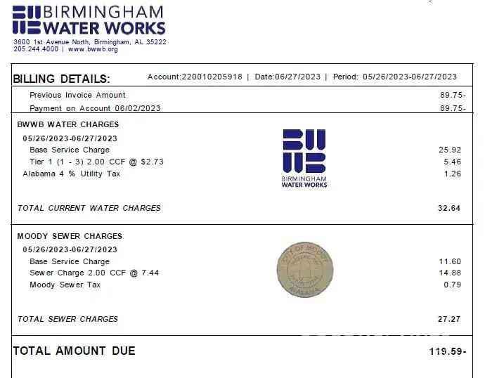 I started service in Moody AL in March 15th 2023. On 3/21 I paid fees to start service of $163.00 and on 3/29th I paid $120.00 for a deposit. On 4/2 I received a bill of $108.49 for water and sewer. This bill is impossible, I could not move into the house until I replaced the flooring and other repairs to make it livable. The bill was for 8 days with almost no water used except for drinking. The base fees for a whole month is currently 38.91 plus water usage. Their math on the bill I downloaded and all the other bills I received besides this one are the same charging almost double what the bill adds up to. I am not disputing the water/sewer usage so far, although the CCF is doubling each month which at $2.23 per CCF is still not concerning, it is the billing that is astounding. Example the latest bill is for usage of 2 CCF so water service is $32.64 for water and $27.27 for sewer, this should be a total of $59.91. Their total is $119.59 all the bills so far are like this. Why is the bill almost double what it should be? How many people are they doing this to? What politician do I have to contact to get this resolved, this is a monopoly you can not choose your water service.