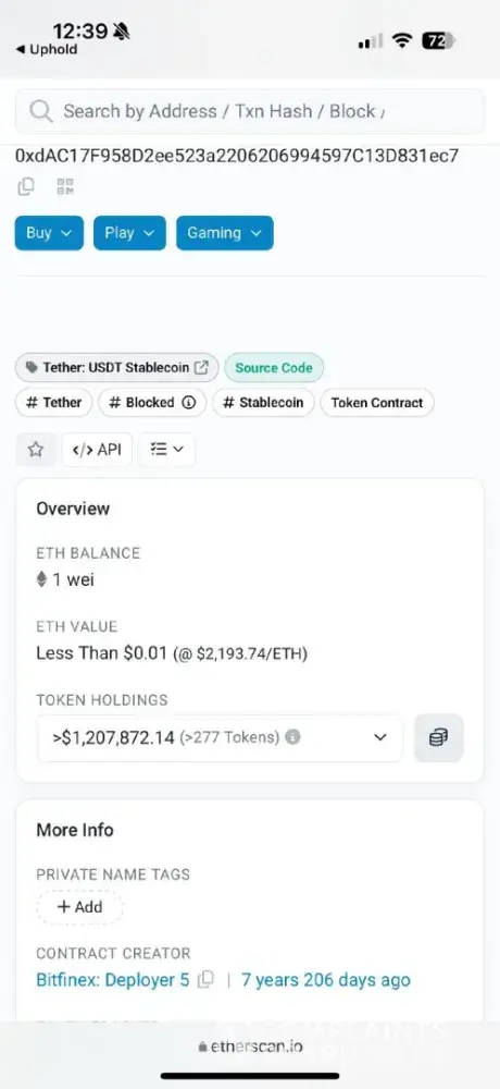 wallet 0xdAC17F958D2ee523a2206206994597C13D831ec7 used app Ne UniverseMax to deceive me an transfer funds from my Uphold account.