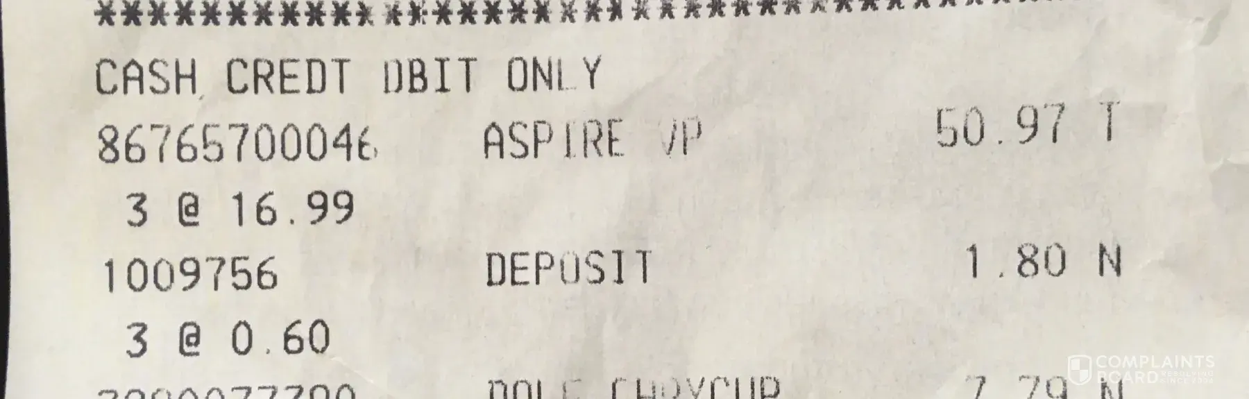 I have confirmed I am being charged the bottle deposit fee of $0.05 Each on my Aspire Energy Drinks & Truly can purchases. I have tried to get the recycling deposit visiting 2 separate recycling locations (Westbury & Green Acres Valley Stream) & the machines deny the deposits. The machines state they are not valid items. -I confirm none of the cans are mutilated -I confirm all cans have clear easily readable bar codes