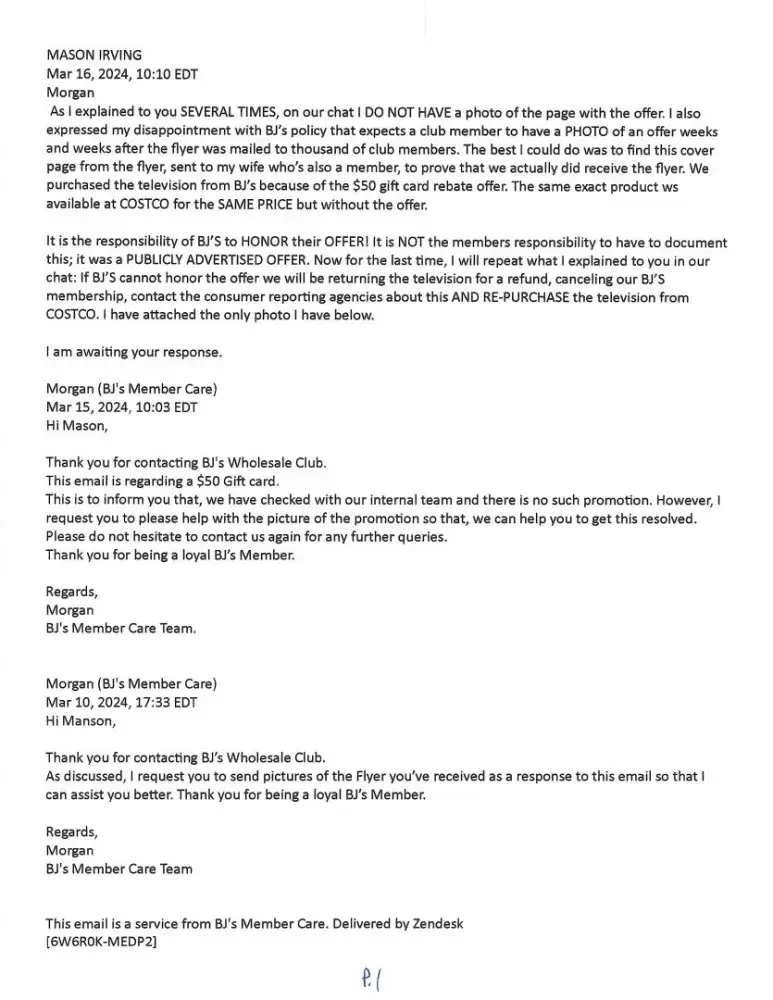 The bottom line is this; we are very upset at how we've been treated by member services, we feel that BJ's is responsible to stand by it's advertised promotion and if we cannot resolve this appropriately we are going to take the following actions: 1) terminate our membership, 2) return all the non-perishable merchandise to BJ's, 3) report the situation any consumer agency that has jurisdiction and 4) share this entire episode on all our social media accounts [this is all 5 family members accounts].