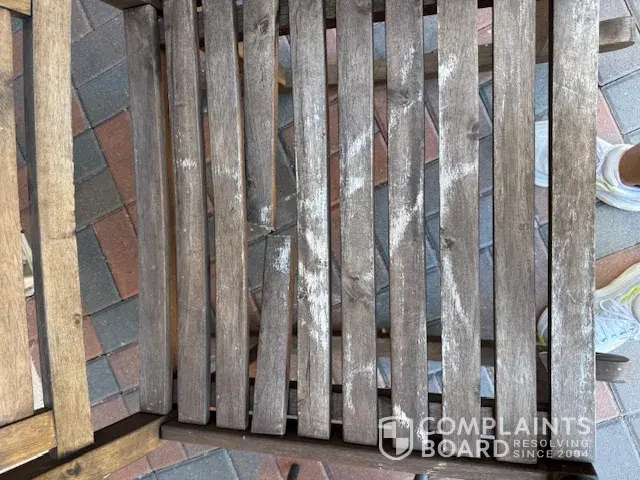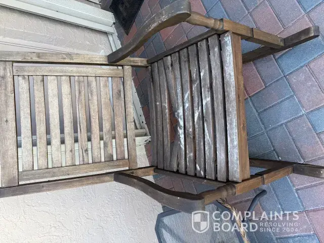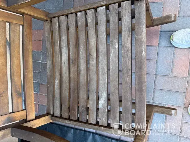 We bought 2 outdoor wood chairs from online BJ late last year. We had trouble with the chairs right from the beginning. One chair broke right away. The company after numerous weeks of back and forth only refunded us $150.00 on this $500.00 dollar picture and we were stuck with one chair that was broken. Now we have noticed that both chairs have badly discolored. It is not worth putting money into fixing or restraining. Why should we. We offered to take the chairs to our local store but they said no. After being a customer for years at BJ's, we feel they should have stood by their customer and refunded us the difference. We are re-think being a customer. We know for sure that we will never buy large items or anything online again.