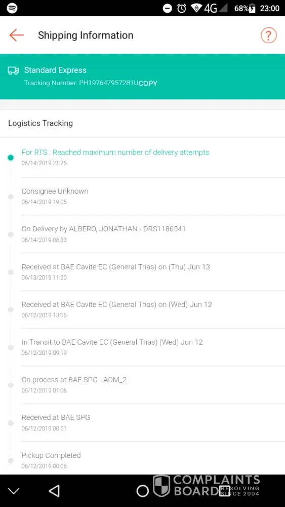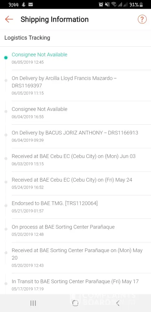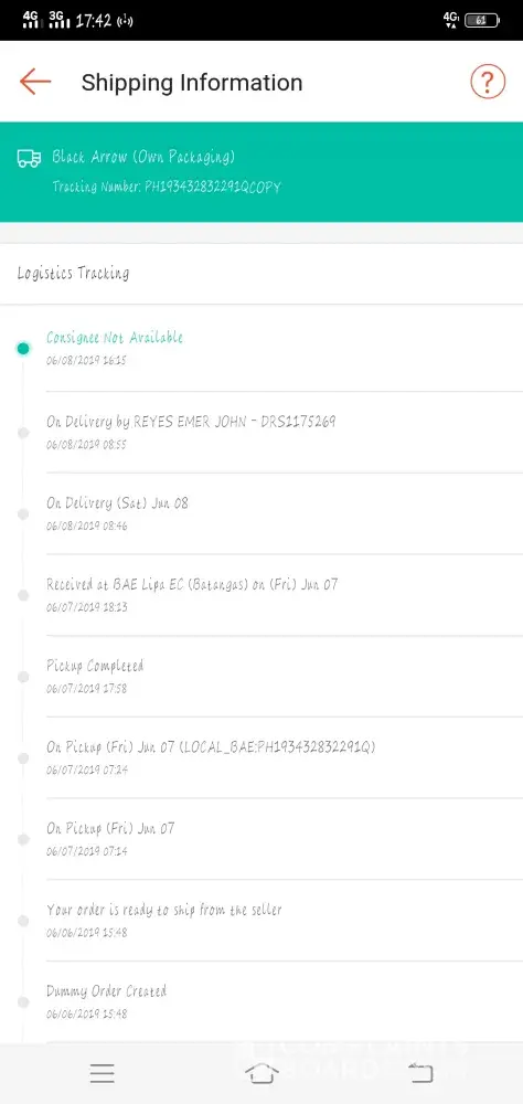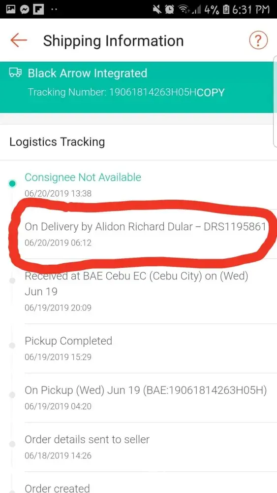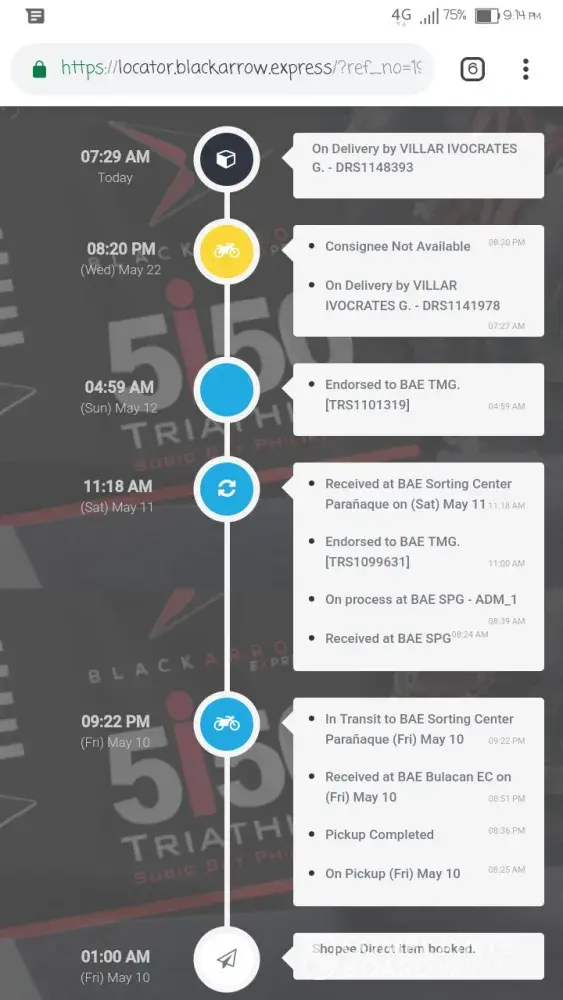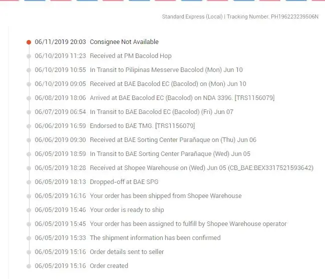 My order which is a dress from Shopee arrived in Cebu City last May 23, 2019 (Friday) according to the order tracker. I received a message yesterday (June 4, 2019) at 10:04am that my order will be delivered and the delivery man called at 11:02am to inform me that he's nearby. He told me that he is already in Pari-an, Cebu City. I was surprised because he was actually quite far from my location. I found out that he misunderstood the delivery location. He thought it's in University of the Visayas-Main (Colon) but it's actually in University of the Visayas-Banilad. He ended the call and I just waited the whole day yesterday until today. I checked shopee's order tracker but I was surprised to see that they indicated CONSIGNEE NOT AVAILABLE twice! I am very worried because it might be returned to sender and I need that dress for my friend's wedding soon. I tried to reach Black Arrow Cebu's contact number which is only one by the way but the line is always busy. I hope to receive my order soon.