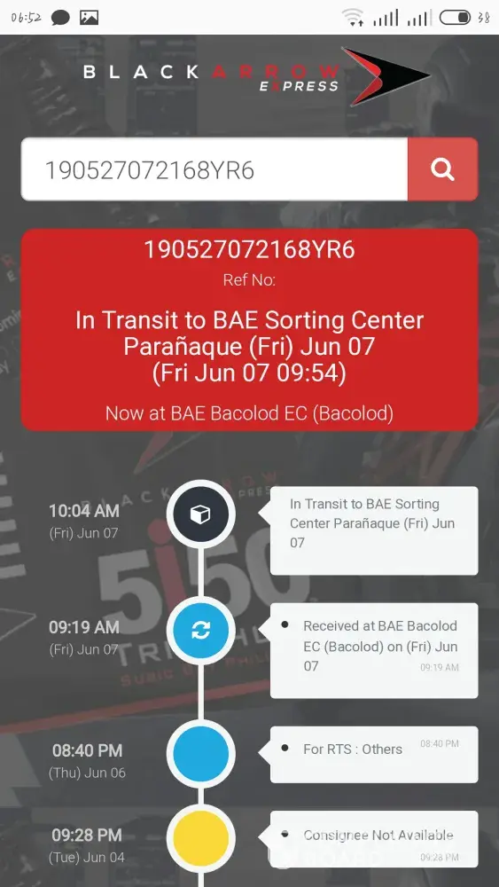 We didn't receive any message or notification from black arrow. We've been tracking our order and it took time for them to deliver our package. When we tracked our order again we were tagged as Consignee Not Available. This is not acceptable. Black Arrow Express should do their job better. I hope they'll fix their delivery system.