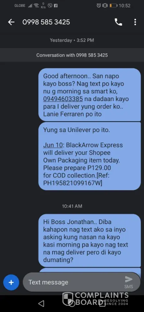 Its been 2 days since i received a text message from black arrow that my item will be delivered by sat. I waited all day but no one came... The next day i also received a text message from black arrow again... And again i waited all day just to received my order from shoppee...but then again i was disappointed... Because no one came... Why do you text the cosignee that their item will be deliver within that day of your text, in a matter of fact no one will be there to deliver their item... Are you joking us guys? This LUNA RANDE OF BLACK ARROW BAE BATINO LAGUNA should be given an action... He does not even text the cosignee if he cant make the delivery...