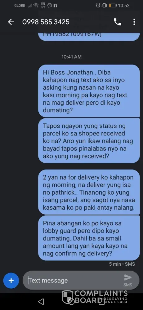 Bakit hanggang ngayon hindi nyo dinedeliver yung order ko sa shopee? Dalawang linggo na sa inyo yon. At dalawang beses nyo na rin akong pinapaasa na dadating na ang order ko. Anong klaseng service meron kayo? Ang tatamad naman ng empleyado nyo! Anong petsa na. MAY 18 PA DAPAT NASA AKIN NA ANG ORDER KO. TAS MAY 22 NAGTEXT SAKIN NA DADATING NA. PERO WALANG DUMATING! TAS NAKALAGAY SA SHIPPING INFO, "CONSIGNE NOT AVAILABLE! PUTA, E HINDI NGA AKO MAKAALIS NG BAHAY KAHIHINTAY SA INYO E. TAS KANINA, ON DELIVERY NA ULIT PERO WALANG DUMATING! HOW POOR A SERVICE YOU HAVE. WTF!