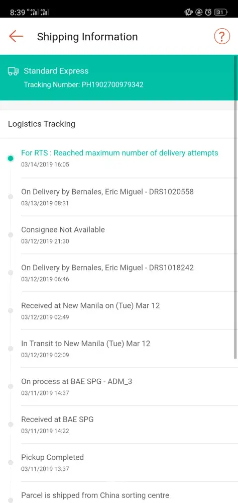 I ordered an item from Shopee. Checking constantly on the tracker logistics, someone named Raymond Mayuyo supposedly delivered my item last Feb15 but I did not receive any message or call about it. The following day, the consignee did not even message me either prior to delivery that it's being sent out.Now the item that I ordered is marked as RTS.