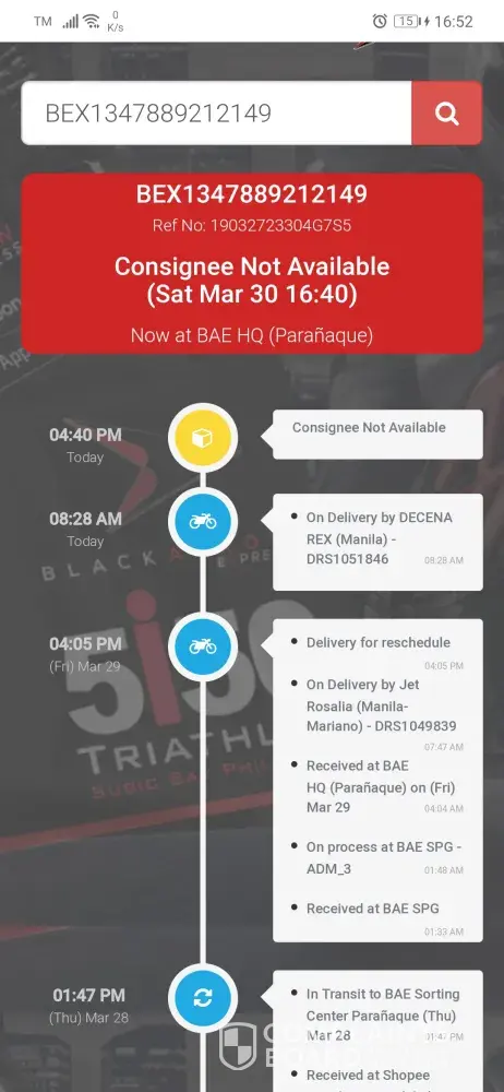 On the same date March 12, in the shopee tracker it said that consignee not available. I was shocked that this was marked as not available when the delivery guy did not even send me a message and failed to contact me.