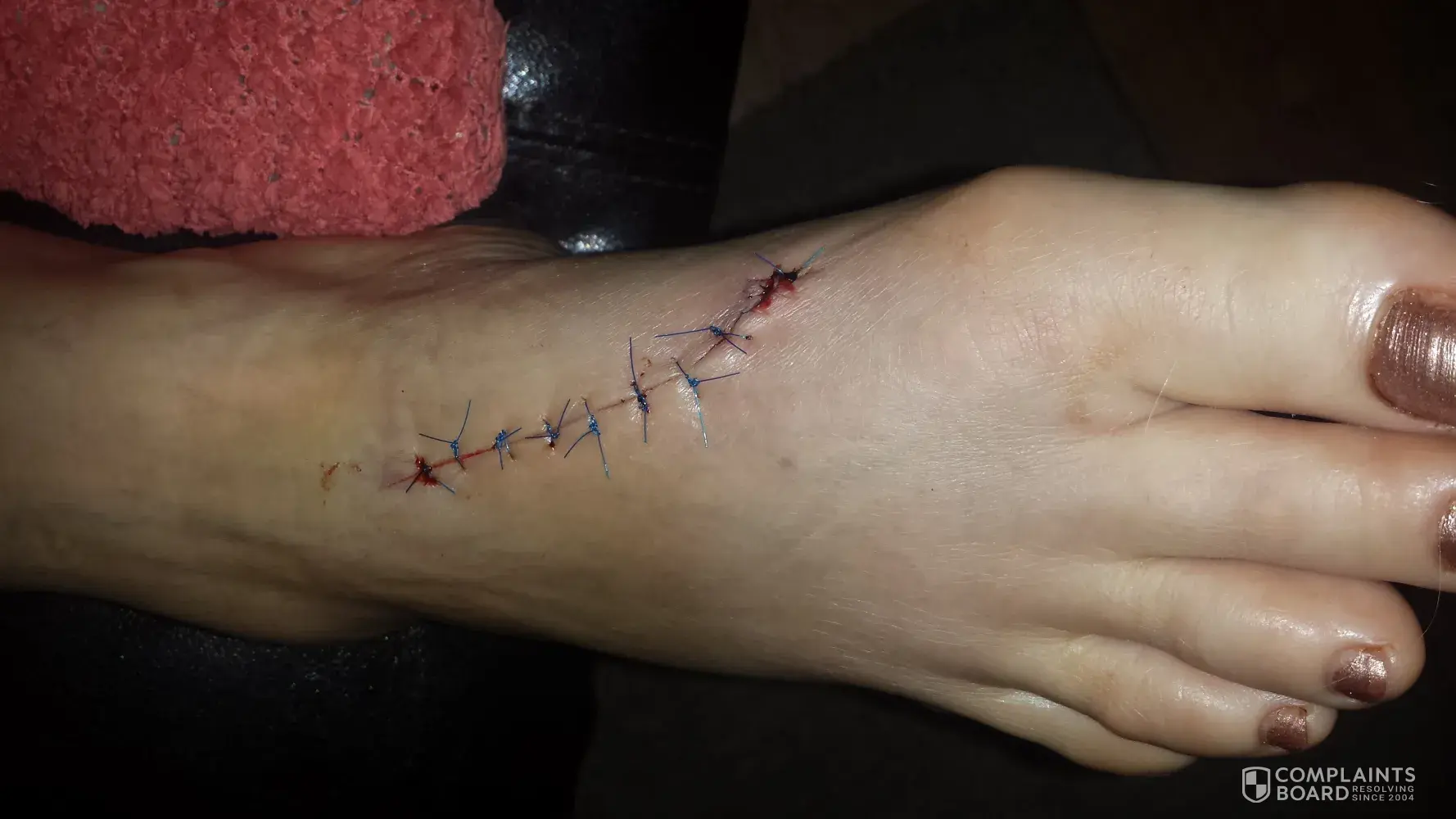 15:05 l'ambulance a été appelé sur les lieux car saignement était très intense. 15h30 arrivé à l'hôpital Ste-Eustache. j'ai eu 9 points de suture. Arrêt de travail. incapable de mettre des chaussures et de marcher normalement, nous sommes le 13 juillet 2018 aujourd'hui et je suis traité pour de l'infection dans la plaie. l'arrêt de travail sera un peu plus long.