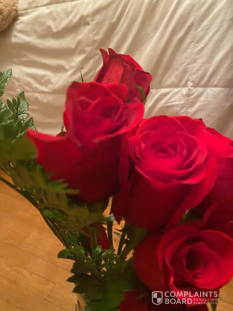 I ordered one dozen gift boxed red roses, 16 days in advance, and I had the delivery set for today because they were for my sister's birthday. The order was supposed to be delivered between 9am-6pm today, but I never received an email stating that the item was "in transit". I waited for an email to arrived, letting me know that my order had been delivered, but I never got one. Around 5pm, one of my family members looked on our front porch and low and behold, there the box of roses were. The roses were left on the porch without the delivery person even ringing the doorbell or knocking on the door. When my sister opened the box, she discovered one dozen half dead roses, with parts of every rose black. They did not look fresh and it looked as if they had been sitting out in a room for weeks before they were packaged. Roses were losing petals and even moving the rose from the box, carefully, caused the rose petals to fall off. My family members have already placed a complaint on the complaints board regarding the company, as this is the second time we has used this service and I'll never use them again. I'm very unhappy with the service and condition of the roses. I have inserted photos of the damaged product and I would like to receive a full refund.