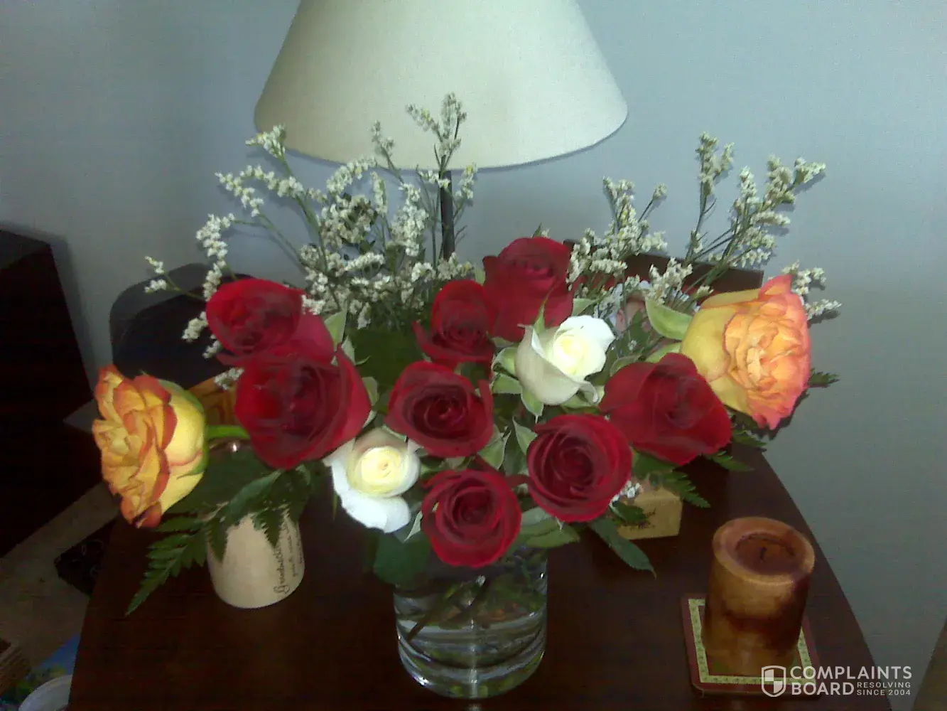 - Emailed to change delivery date (1 week in advance). No response. Finally did a Online Chat and had person confirm new delivery date (but did not print out chat log). Flowers still arrived on original delivery date. Flowers were broken, missing candles, ribbon, & pine cones, and greenery was not varied.