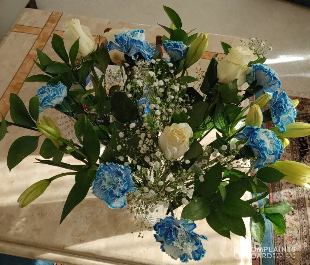 The flowers were delivered three days late, on Feb 28. What was ordered (Blue Horizons "supersize" — the website show eight roses, star gazer lilies, irises, premium fillers) was a far cry from what was received (four roses, a shabby batch of badly-dyed carnations and cheap filler). There is nothing on the website suggesting that "fair and appropriate substitions" in their most extravagant pricing option would result in fewer flowers and trashy ones at that. Neither does the website mention that specials will not be honoured outside of their "local" delivery zones (again, no indication of said zones). Though far less of an issue, but just as misleading, they charged $10 for "authentic Scottish shortbread" that turned out to be two very thin cookies.