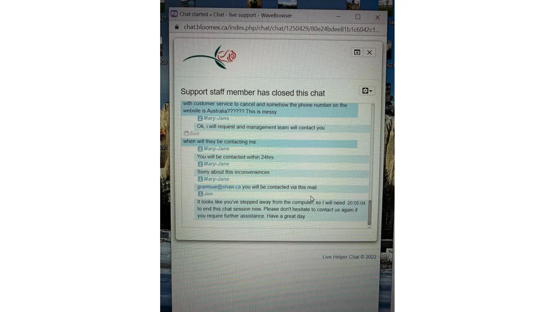 I entered the Bloomex website on May 23, 2022 and was assigned an order #[protected]. I NEVER pressed the submit order button, however, because my credit card was already on file by setting up my account, the order was processed by Bloomex. Then I received a message that my order was "on the way" when the order request date was a pre-order date of May 31. I immediately chatted on-line with an agent requesting cancellation and basically they said they would change and ensure the order date. After requesting several times to just cancel the order, they refused to do so. I called on the telephone line to customer service and three times I was hung up on. I followed up with an email and was advised the next day that I had to cancel within one hour. WHICH I TRIED TO DO as outlined by attached. Since nobody would help me cancel the order, I provided a delivery address (since the order was NEVER finished or submitted). The order arrived today and as outlined in the attached photo, my "Beautiful in Blue" order arrived not even close to advertised. The order I received was various shades of purple yellow & white 90% filler flowers. I have bought nicer and healthier bouquets at my local grocery store. One and done for me. I have told everyone I know about the horrific customer service I received, topped with the delivery of a pathetic vase of flowers. It will be viral and