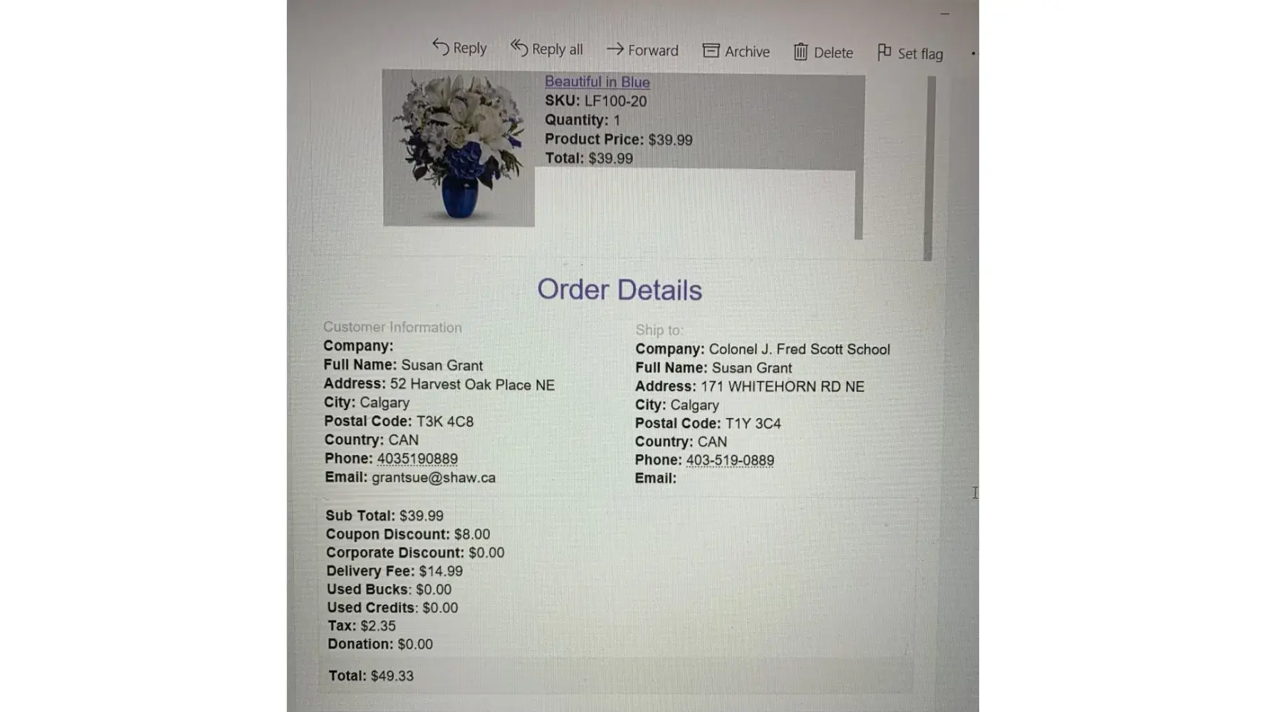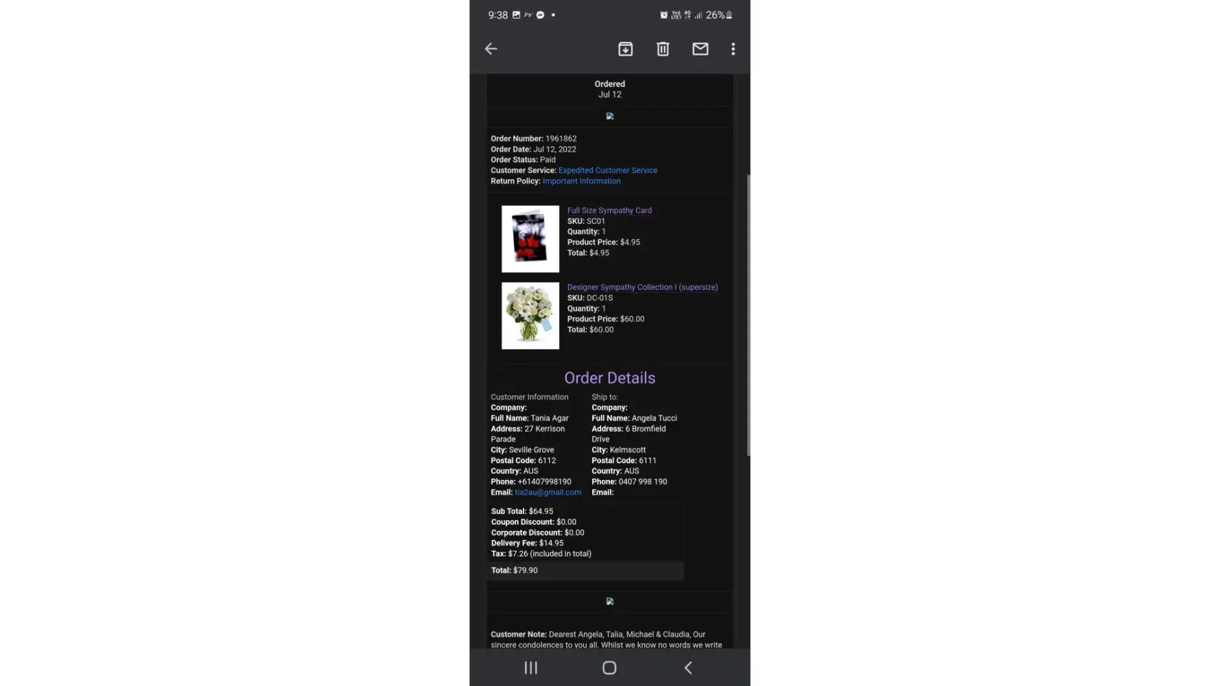 Discovered that some bunch of flowers were finally delivered 6 days later by another family member.