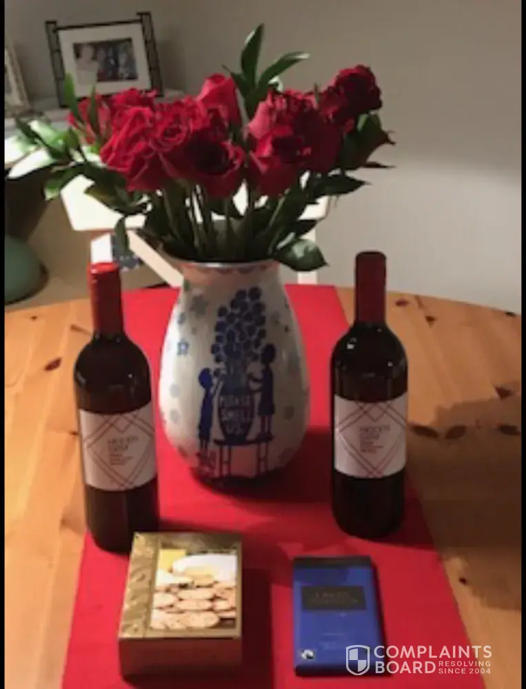 They delivered - a dozen red roses basic (superior quality includes additional buds etc), 2 x bottles of cheap plonk, a small box of water biscuits, a bar of cheap chocolate.