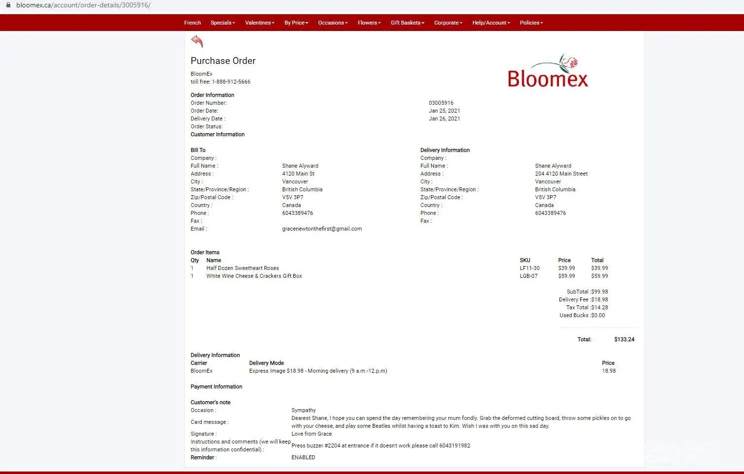 I have been a customer for Bloomex for a couple of year without any wrongful doing from them. But it was too good to be true! I ordered flowers delivery on the 13 Feb 2021 and extra was charge to that effect (14.99$), for a total of 103.76$.