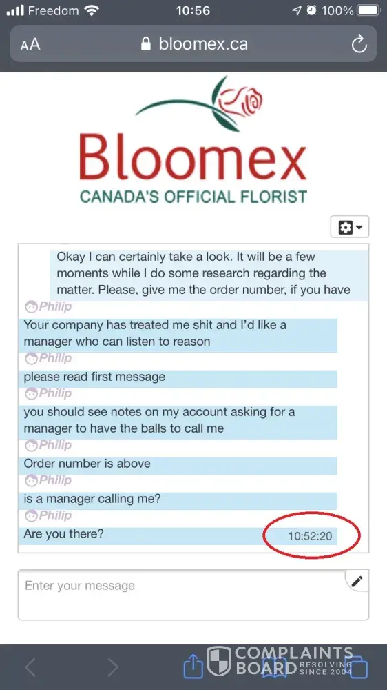 7. I call back to place an urgent note for the manager to call me URGENTLY. I'm told by your agents that they can't do anything and have zero power to sort this mess out. I'm not ever offered ANY recompense - just told a manager will reach out to me via email but they "can't promise when a manager will be in touch". it seems, your chat agents are not sure their manager knows how to use a phone and can't control how the managers will contact me to deal with customer complaints. smoke signals perhaps for all I know?- -- and via EMAIL!?!?! Why not call me to sort this faster?! I tell the agent to tell them to call me! - Bloomex Please Train your managers to have the guts to phone customers who you have let down and show us how much you [protected]@bloomex!