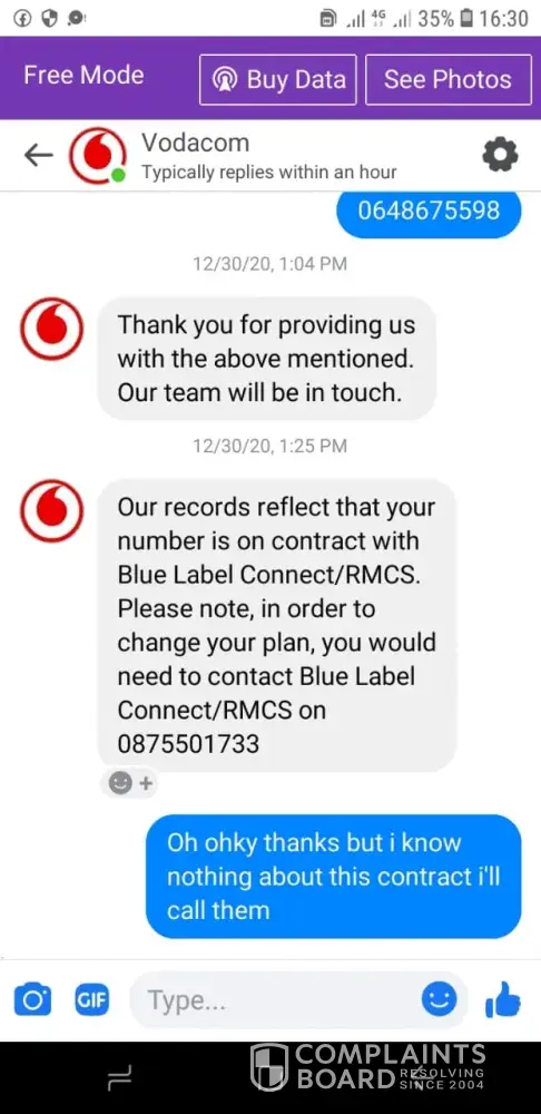 I am very disappointed at the scam that this company is doing. I had my vodacom number for years, I don't even remember for how many years. I have damaged my Sim card and I went to do a Sim swap and I was told that I'm under a contract with RMCS account holder Blue Label connect. I have never signed a contract or have an airtime agreement with anyone. Now I can't have my number back, which is linked to all my personal details. I called you guys and you told me that will take 7 working days unless I buy Sim card at vodacom for R63 and call you guys again to do a Sim swap for me that will take 2 working days. Please remove my number from your data base and give me my no back.