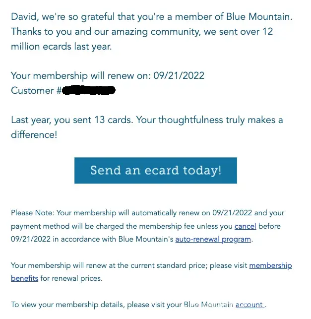 I Love BLueMoutain and that if you dont realize it is an automatic renewal as stated in the terms of sale, you should read the terms of sale before you sign up for anything. Dont blame them because you misready your contract. I have a Bluemoutain account and every year i get a renewal notice saying my accoutn is coming up for renewal and it does state that if they do not hear from me it will automatically renew. You ppl just need to read what the hell yall sign up for.!