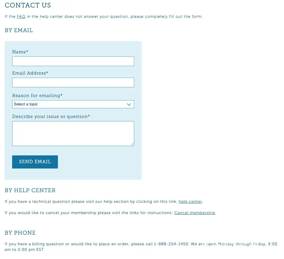 And right there on their "Contact Us" page they provide a link to their Help Center, a link to Cancel memberships, a phone number, and a link to submit a question/concern/issue.