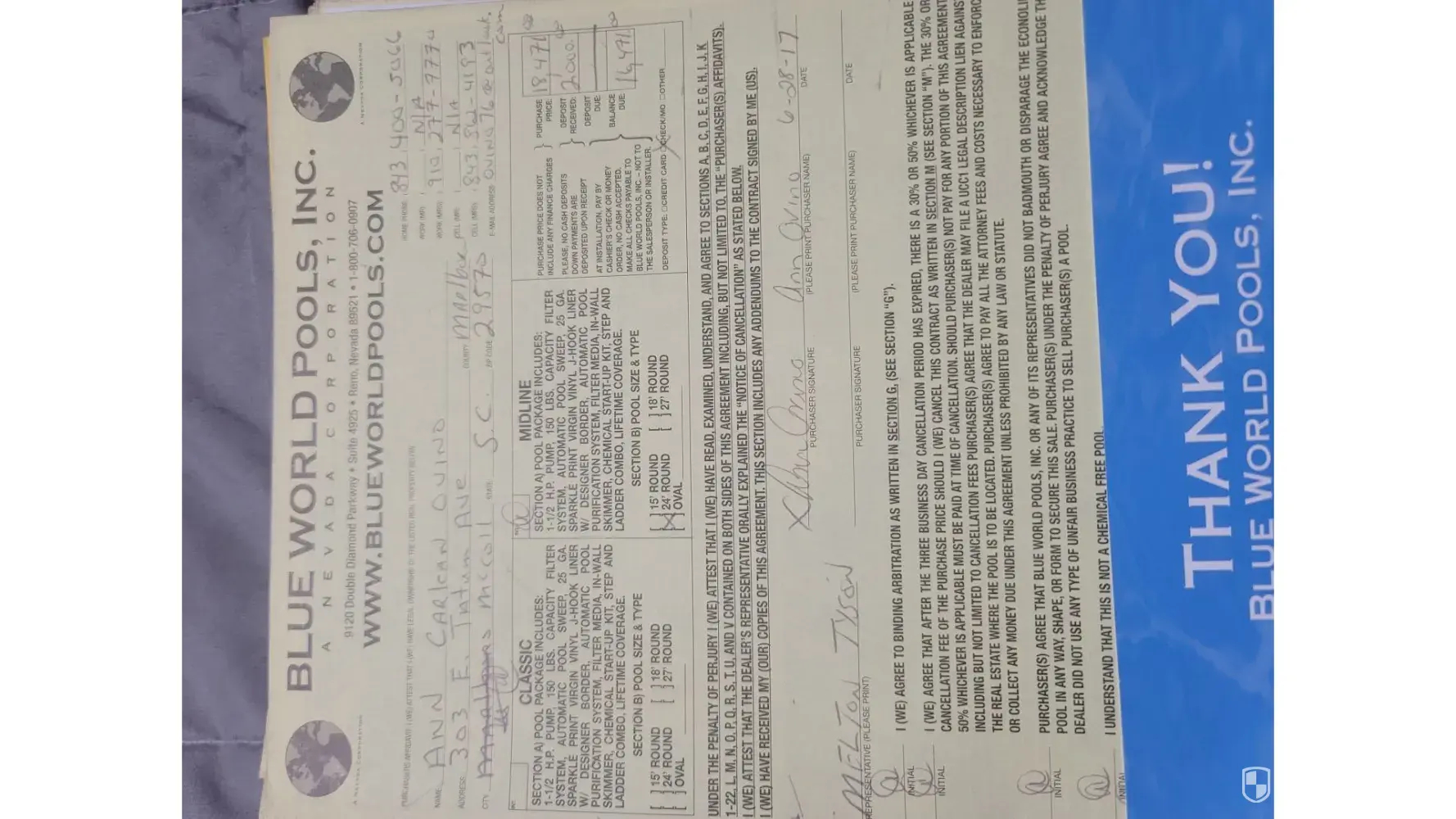 My husband and I had no clue, nor did we read any reviews regarding Blue World Pool. We were very excited about purchasing a pool for the grandchildren and aide in some therapy for my husband. We paid a deposit of 1, 000 down. We kept asking the price of the pool and the salesman reply was "Oh we getting to that later". He got over on us, pure peer-pressure, fast talking as he was writing up the contract, he was having me go look for personal documents and when I would come back his statement to me was "oh sign here and" oh you need to get this document ". I was not paying attention. He tricked us into signing a 12-year contract paying 471.00 a month for a above ground pool. They cashed our check and I called to cancel once we realized our mistake. They claimed we need to contact the cancellation department on Monday. I called and they said" Oh it's too late to cancel. You signed the contract, and we have to honor that, either pay us over 8,000 or let us install the pool". Days later Blue World Pool called again and offered us a lower payment at a different %. I again told them," WE WANT TO CANCEL". A lady in the office of Blue World Pool called with an even different quote and we still refused. Her comment to me was" This is like a cancer It will not go away. You are obligated to this contract ma'am." I thought that was so unprofessional of her to say, because I do have cancer, breast cancer. They took advantage of us being old people and to top it off my husband is a United State Veteran suffering with progressing dementia. These people are a joke, and something needs to be done to stop them from keep ripping people off. It has been 6 weeks now and we still don't have nothing, no pool, dirt, equipment nothing has been delivered to our property, my question is why Blue World Pool will not return our deposit and stop with the harassment.