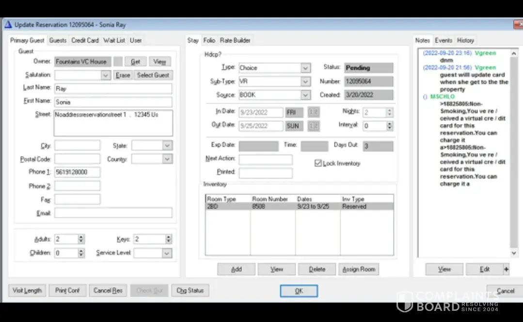 I initially made my reservation through Booking.com in March of 2022 for my birthday weekend. The card I made the reservation with was lost in August. Booking notified me on 9/17/22 to update my credit card. When I went to do so on 9/18/22, Booking had already cancelled my reservation. I contacted booking directly and was advised that I'd have to contact a manager at Bluegreen Vacations directly to reinstate the reservation. When I did, I spoke to Virgil Green who identified himself as a manager. I explained to him my dilemma that my credit card that the reservation was booked with had to be replaced due to being a lost card and booking asked me to update my current card but when I went to do so, they'd already canceled my reservation and advised me that they didn't have any more showing on their website and I'd have to Bluegreen directly for reinstatement of the reservation. Virgil was very understanding and assured me that he'd fix and reinstate my reservation for 9/23/22 - 9/25/22 as booked on 3/20/22. I asked him to send me confirmation of same as I didn't want any issues when it was time for me to check in on 9/22/22. He told me he could send me a hotel screen shot showing that my reservation for 9/23/22- 9/25/22 was now reflecting again as pending and that all I would have to do and provide my credit card along with a $100 deposit at checkin. I offered to give him my credit card that night (9/20/22) that he reinstated my reservation but he advised me that that was not necessary and that I'd simply provide it at checkin. When I arrived to the property to checkin, I advised that my reservation had been cancelled. I showed the property the email hotel reservation confirmation the Virgil sent me on 9/20/22, however the hotel simply advised me that there was nothing they could do about it. The young lady called Virgil to the desk. He introduced himself to me and told me he didn't know what happened as he checked the night before on 9/22/22 and saw my reservation still in pending status so he doesn't know what happened overnight or why it cancelled but he was going to make sure that the young lady at checkin found me something and took care of me. The young lady and Virgil both simply disappeared and when she came back, she advised me there was nothing she could do and that they had nothing available. Another manager Alex came out and told me there was nothing he could do. When I told him I would be making a formal corporate complaint he advised me he was sorry. Frantically as I stood to the side seeking somewhere else to house my family, he came over and asked me to hold 15 minutes as he was going to see what he can do for me. Mind you, he disappeared for over 30 minutes so I went into panic mode having birthday events already booked for that time and I needed to be checked in my resort to prepare and get dressed for the same. Nevertheless, I was able to get booked at the property next door (Floridays) for around the same price that I had booked The Fountains for but the stay was not to my standards. I was depressed my entire birthday weekend and my mood that weekend was extremely down when I should have been on cloud nine. Needless to say, my birthday weekend was ruined simply because Bluegreen Vacations fail to deliver its promise to me when Virgil reinstated my hotel reservation. As you can see in the enclosed screenshot of the reservation Virgil sent me, there's notes indicating customer to update credit card at checkin. It also shows the date he reinstated my reservation on the night of 9/20/22. I wasted a trip to Florida. Flew in only to not be able to partake of the hotel that I booked.