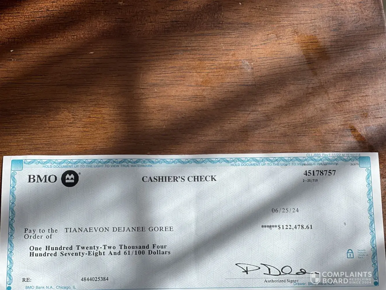 Check number [protected] for $122,420 which was issued march 8 2024 Around April 26th 2024 I was then told to wait 9 day for funds to be deposited . On May 8 2024 United States treasury department verified check was valid and verified and BMO issued funds then out of nowhere froze account with funds and claim they were unable to accept my verification...