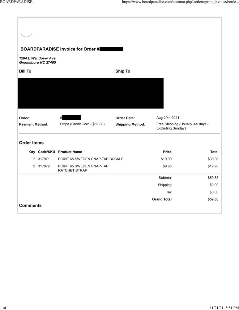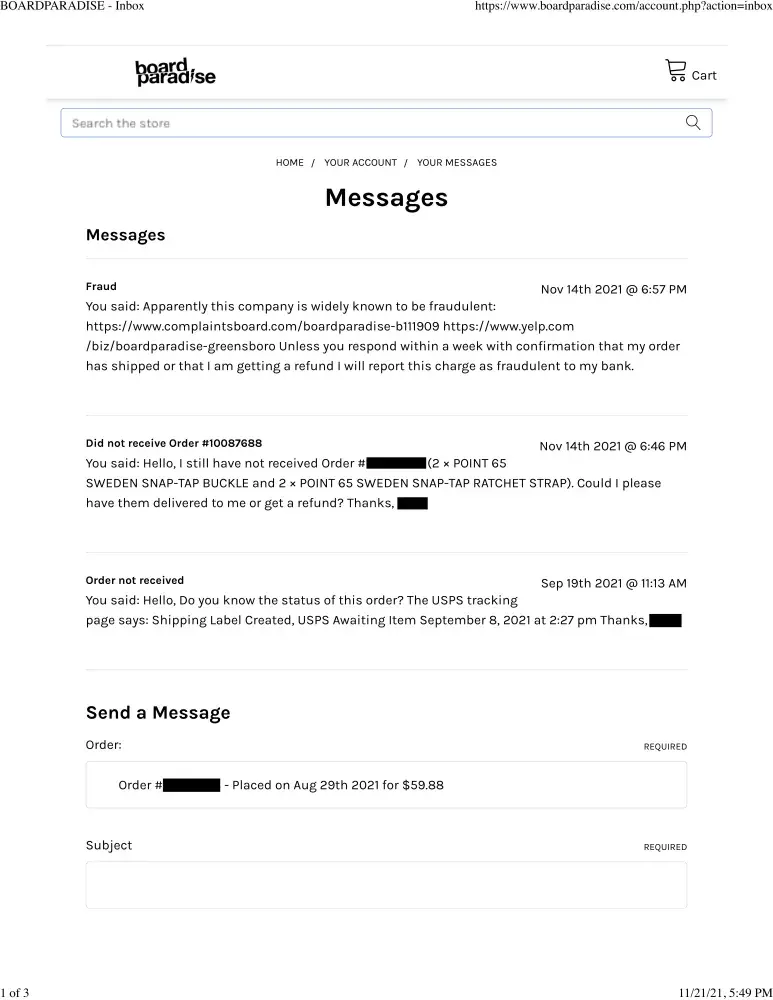 from the website boardparadise.com, but I still have not received the order as of Nov. 21, 2021. I received a USPS tracking number for the order, which states "Shipping Label Created, USPS Awaiting Item". I have not received any notification from the company about the order.
