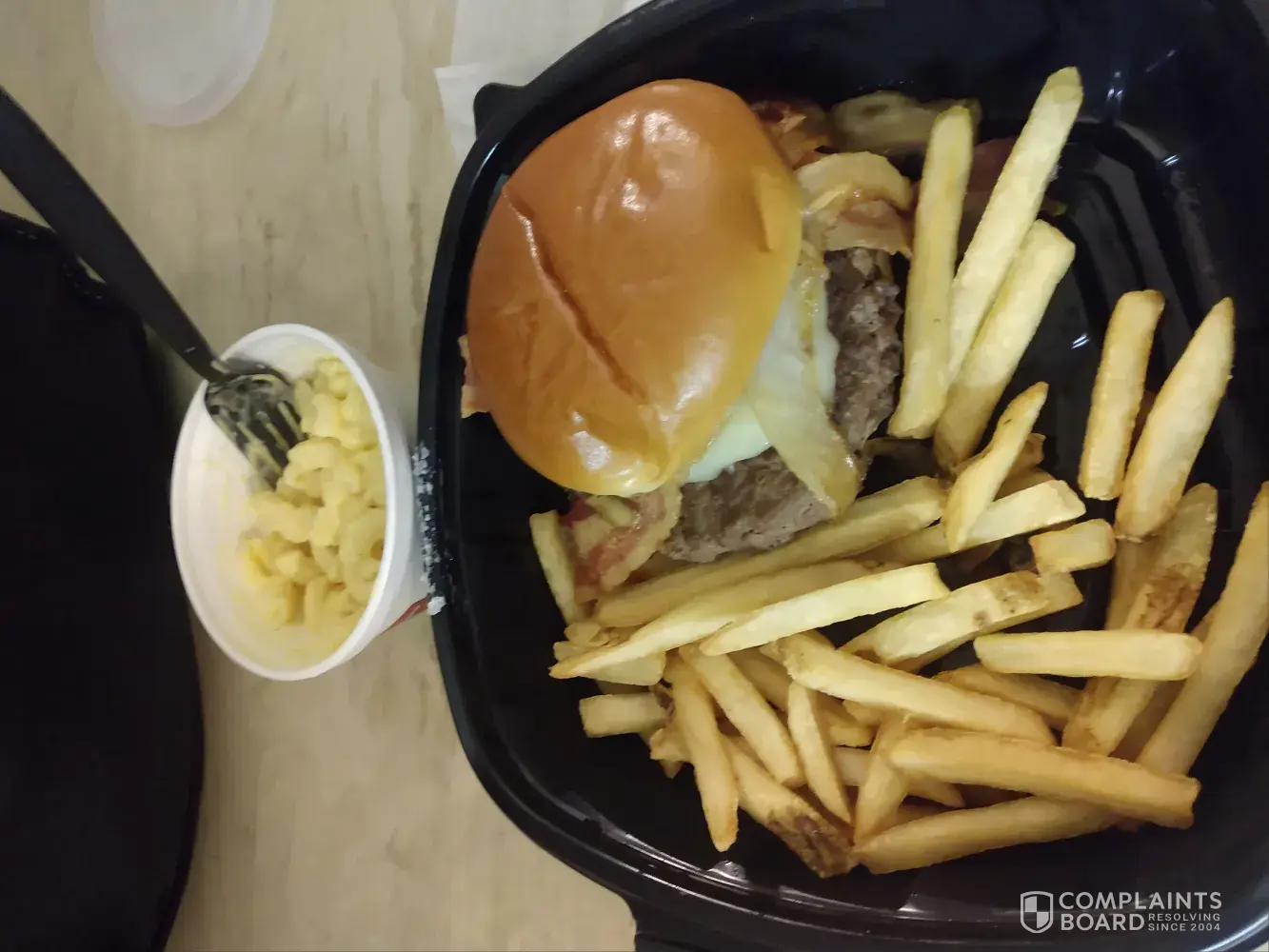 Ordered the Smokehouse burger well done, a little pink when I got it and the bacon was barely cooked. Ordered loaded fries and there was nothing on them. Ordered Mac n cheese and it was dry. The whole order was supposed to be ready in 30 minutes but I had to wait another 10 minutes at the restaurant when it wasn't busy. Everything was cold and had been sitting there for at least the 10 minutes I stood there. It's cold outside and the food doesn't sit under a lamp but about 15' from the door. Order #890115. I will not go to this restaurant again even though they share a parking lot with the hotel I frequently stay at.