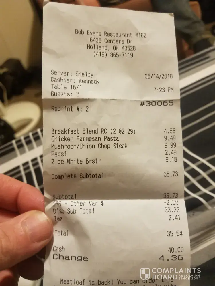 service @ bob evan's restaurant ripley, wv 25271