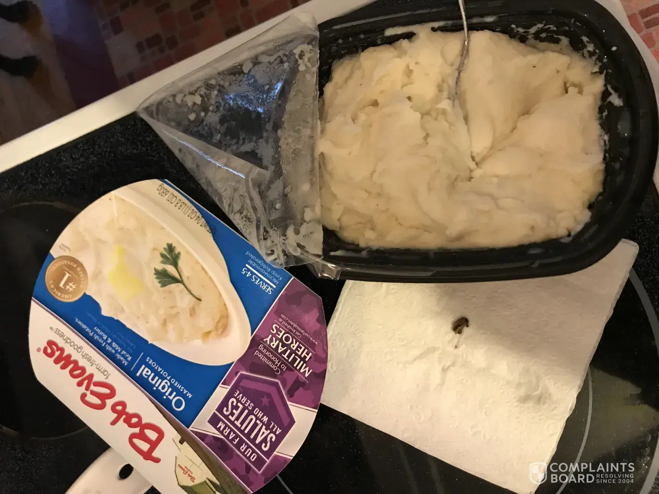 I just bought the Bob Evans original mashed potatoes to go with tonight's dinner. As I pulled them out of the microwave to stir, I found an unknown black object in it. We had to throw away the entire tub not knowing what it was. Needless to say we were very disappointed. We are an active family that is in need of quick meals before sporting events.