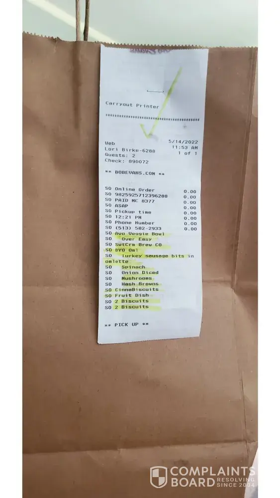 Desired outcome: No action required, I will not eat at Bob Evans again!