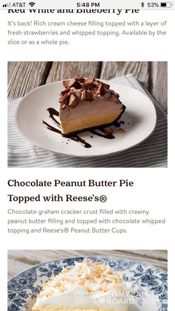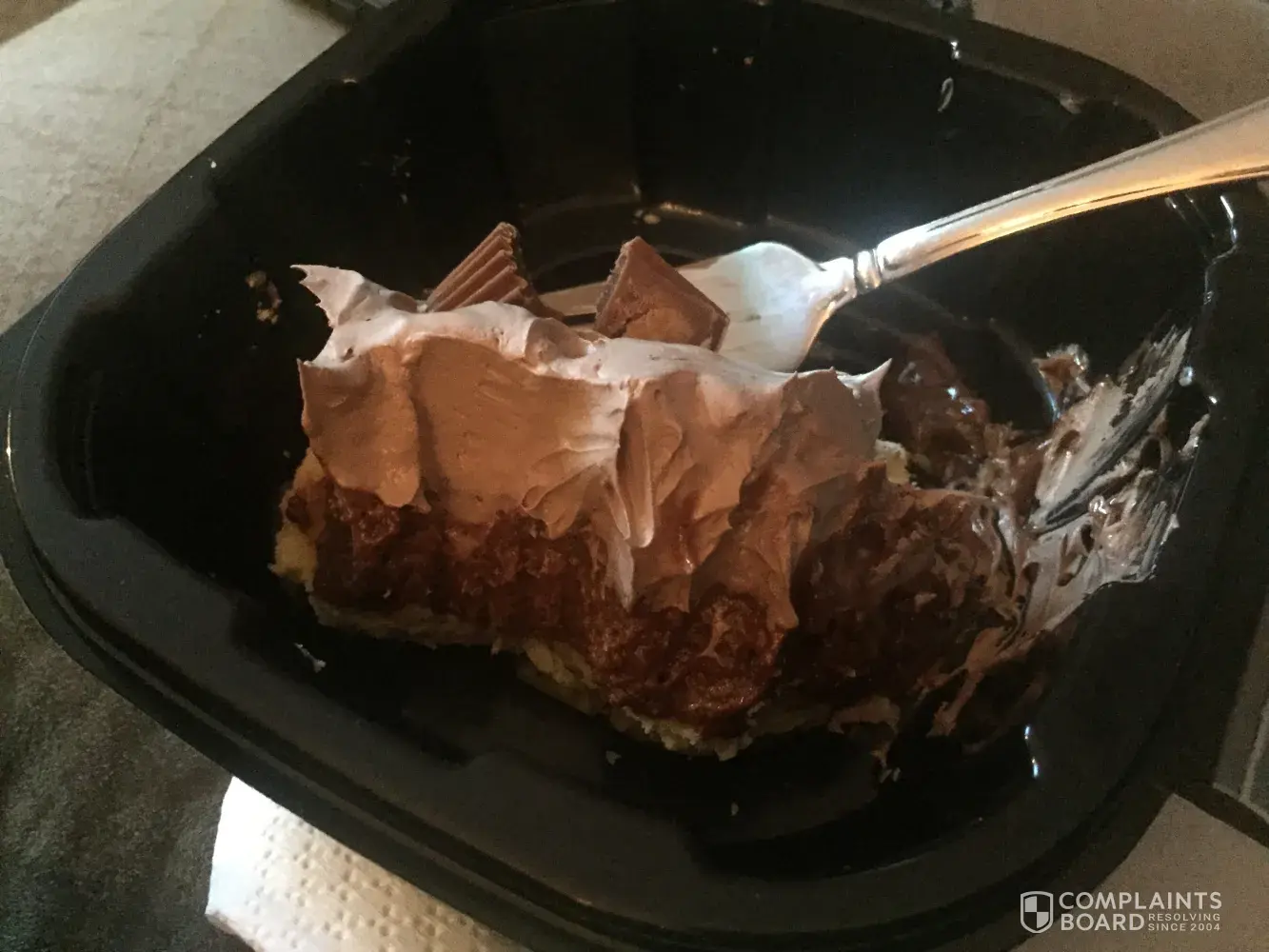 I bought a slice of the Chocolate Peanut Butter Pie and as you can see by the photos Bob Evans advertises a creamy peanut butter filling and chocolate crust. Well as you can, also, see by my slice there is no creamy peanut butter filling and no chocolate crust. This is more like a chocolate pie made in someones kitchen.