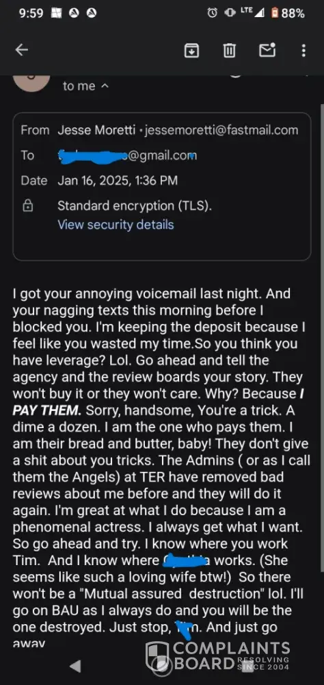 I'm coming to New Orleans for a week to enjoy the Big Game and wanted some fun time and I stumbled on an "Anti Tryst" twitter and IG about scammers/thieves and found something real awful about a New Orleans lady Jesse. Theft, threatening clients with their personal data, blackmail (yikes!) Sure enough this email threat is right from this lady Jesse's email address, you can clearly see this. I'm attaching what I found. I'm glad I found that and your complaint before I booked any appointments, sweet Jesus.