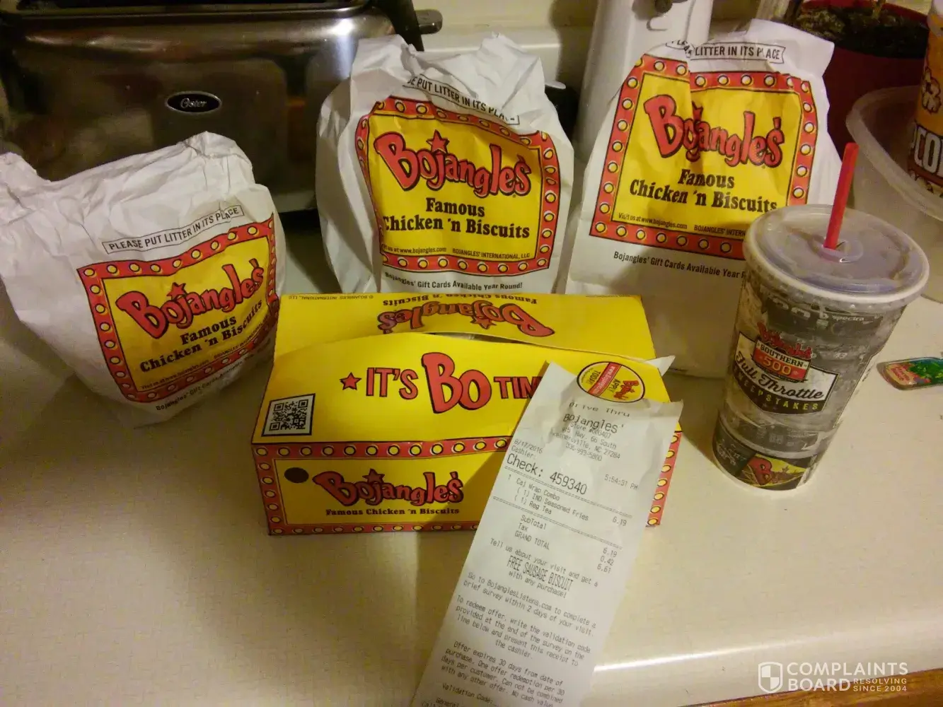 This nightmare has left a bad taste in my mouth so to speak about Bojangles now. I am pretty sure I will not be going back to that Bojangles ever again if any Bojangles. I am so very disappointed. I feel it is my obligation to let you know my experience. I really hope and pray that this does not happen ever again but from what I experienced I am pretty sure it will if it hasn't already. No one deserves to be treated this way! NO ONE! I will more than happy to discuss this with you by phone or in person. I really think both of these individuals do not need to be working and interacting with the public at all! I came home and sat the food on my counter and took a picture. I have attached the picture t this letter. I was in such disbelief! Was this for real? Did this really happen? WOW! How are you going to make this right? Do you actually care about your customer like you claim? Feel free to contact me at [removed]. My 1st ticket #459340 at 5:54 pm.