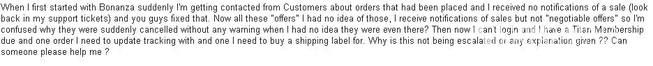 Great customer satisfaction rating and about 30 sales. Out of nowhere 44 emails canceling negotiable offers from users on products that i sold even though i never received any notification (Obviously offers didn't exist) . All my seller fees were paid minus the renewal of there bloated pro seller membership but that just knocks you down to a basic seller if you choose not to continue. Then i suddenly couldn't login, i opened support ticket after support ticket asking why i could not login and i had 2 orders that my customers paid for and i needed to print shipping labels for. . . Guess what? No response ! Not one ! Not even the common decency to say i'm suspended, banned, nothing ! Honestly i had great ratings i'm completely speechless ! I've paid them more in there "superior" selling fees and again bloated pro membership (Was giving it a chance) then what i actually profited ! Please don't waste your time with the a copy / paste "safe" response that i have seen time and time again after a quick simple google search> we are sorry for the not so good experience you have had on our site. We are dedicated to doing our utmost to assist you in anyway that we can. If we can be of further assistance to you, please contact us at [protected]@bonanza.com so we can properly assist.