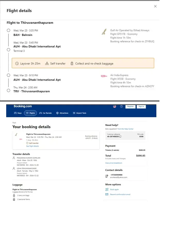 Bahrain to Abu Dhabi by Gulf Air and Abu Dhabi to Thiruvananthapuram by Air India Express. We had reached Airport on time.