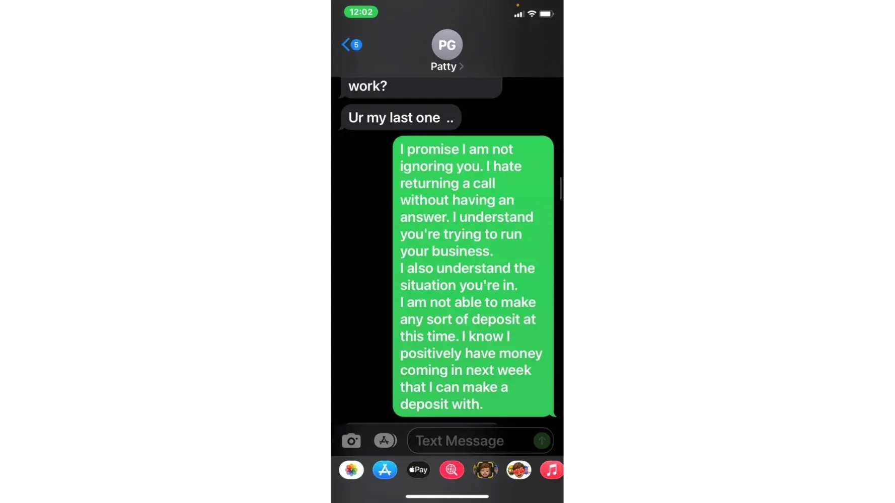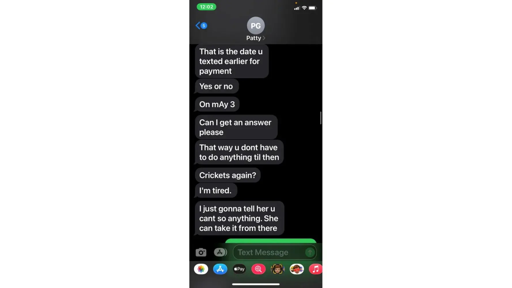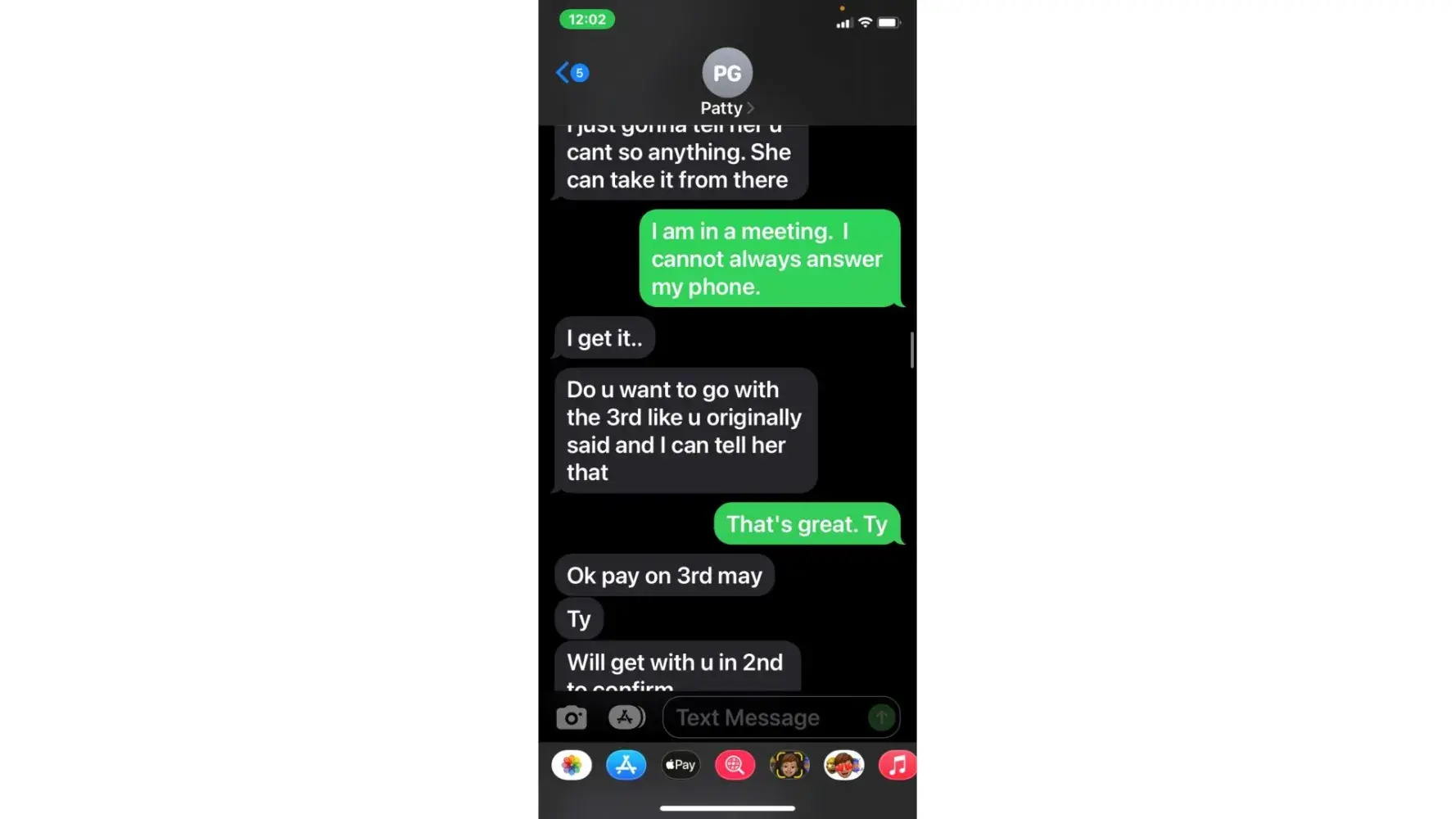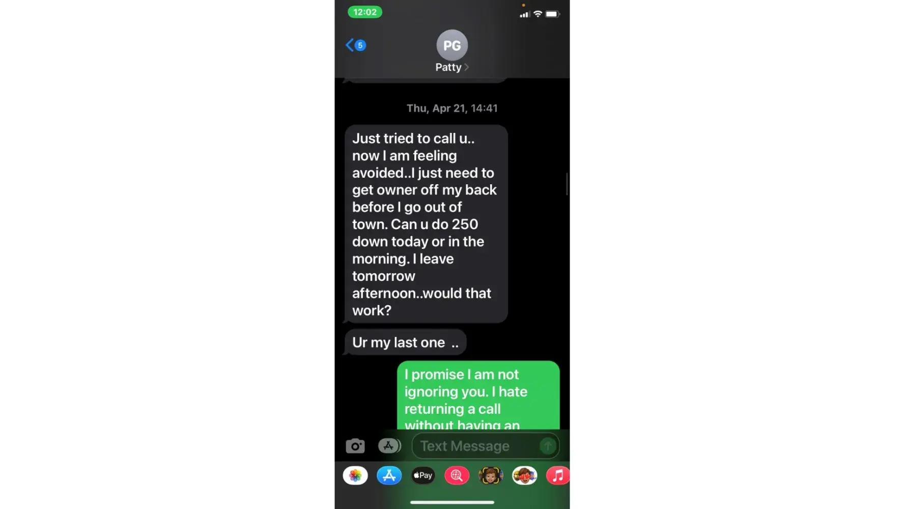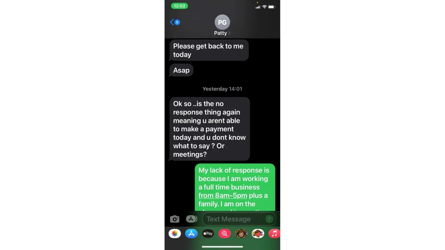 5. when she called 5/3 (the agreed upon date for payment) i was unable to take the call due to being at work. She then started texting me. "is the no response thing again meaning u arent able to make payment today or u dont know what to say? or meetings"