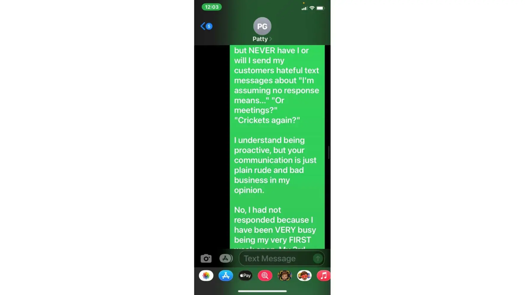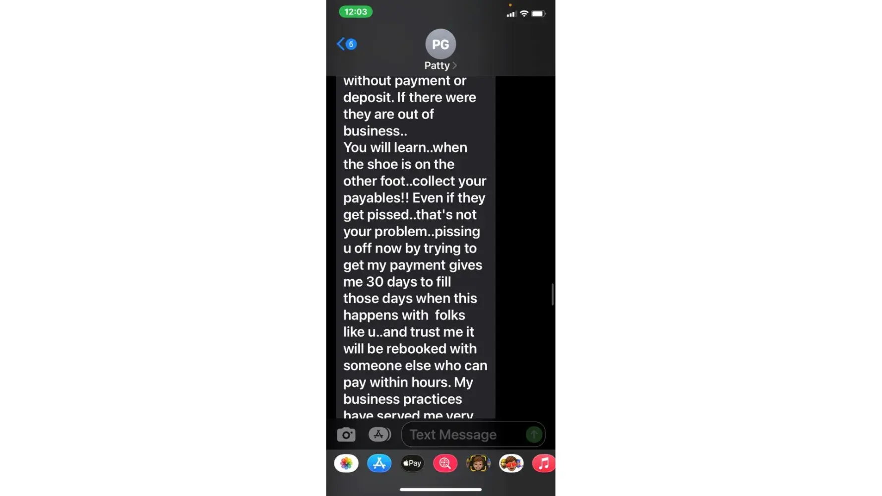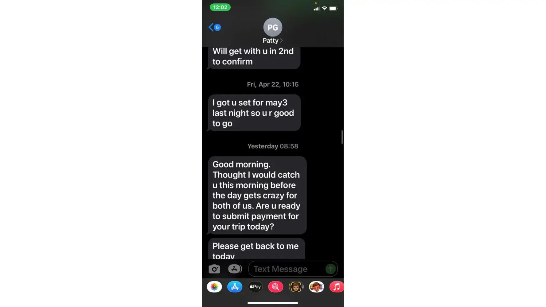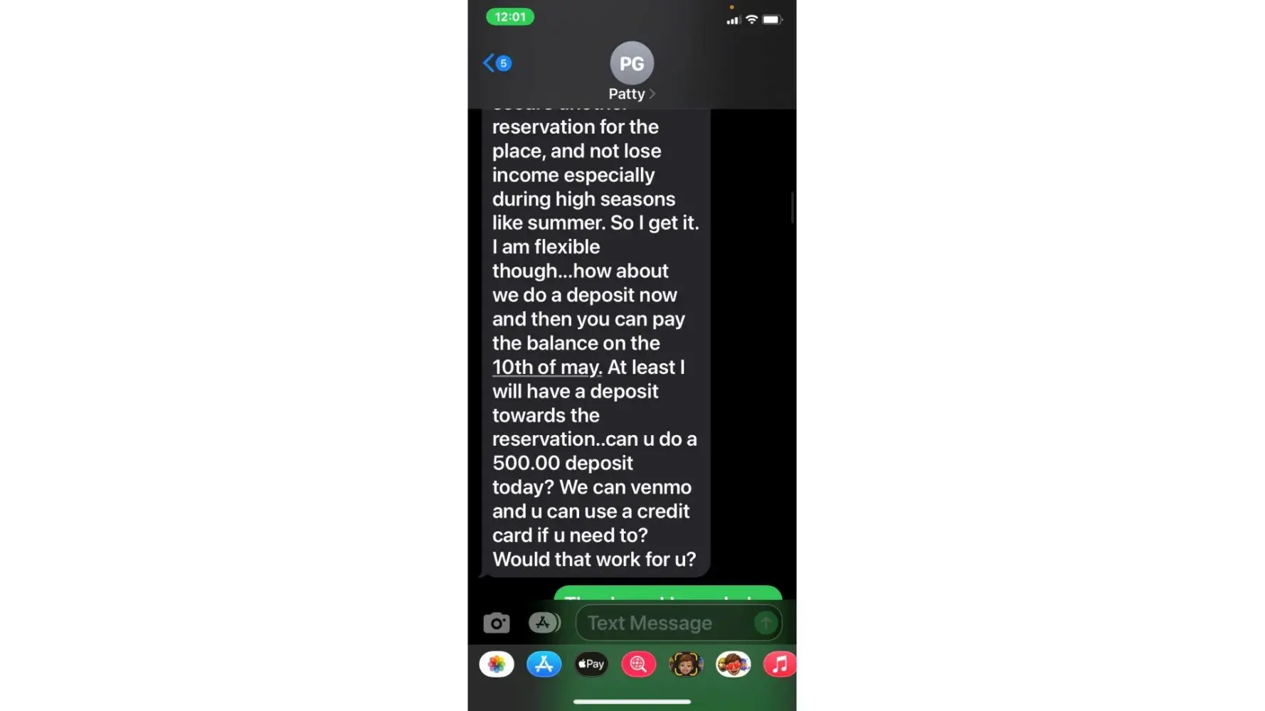 5. when she called 5/3 (the agreed upon date for payment) i was unable to take the call due to being at work. She then started texting me. "is the no response thing again meaning u arent able to make payment today or u dont know what to say? or meetings"