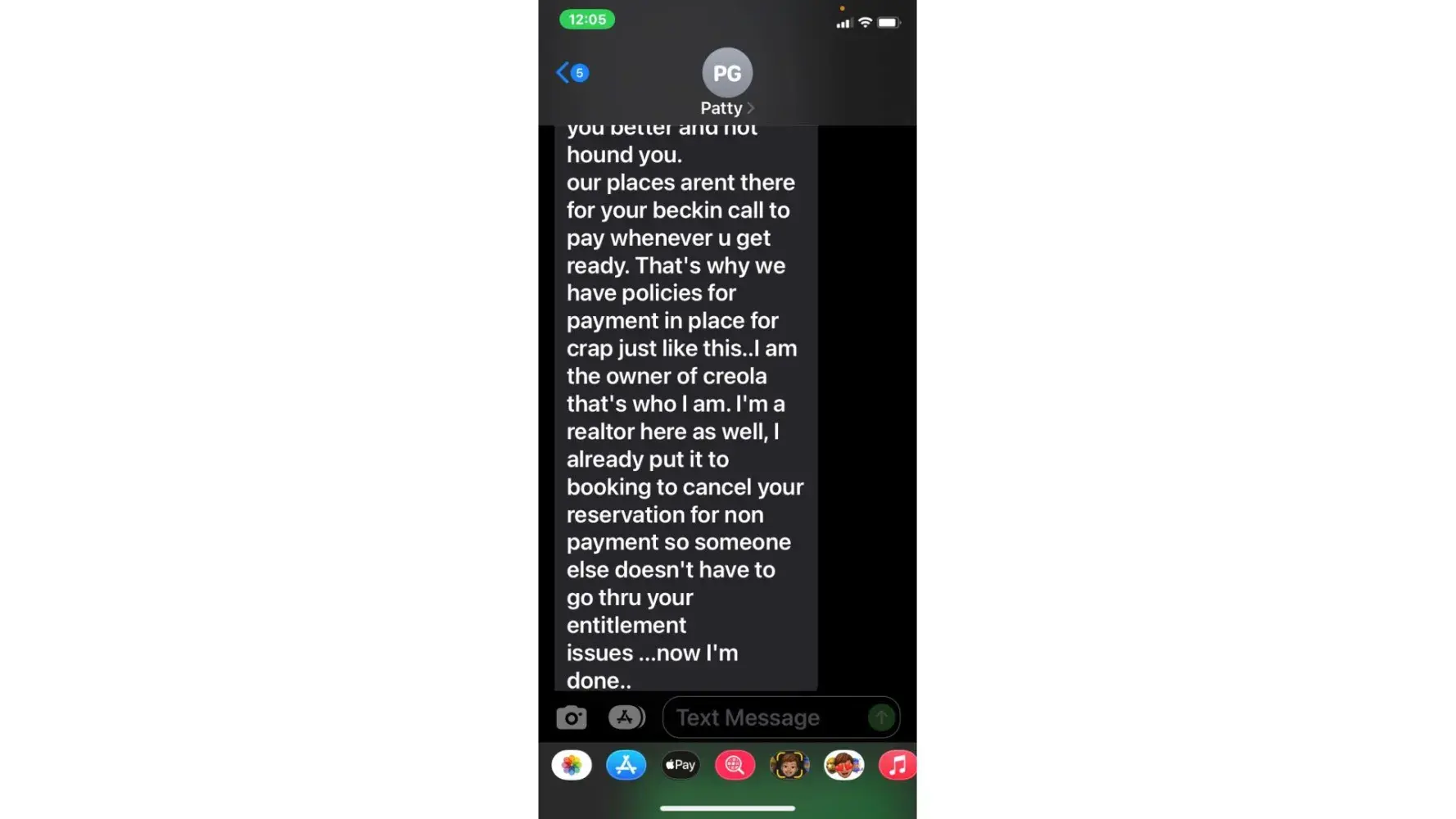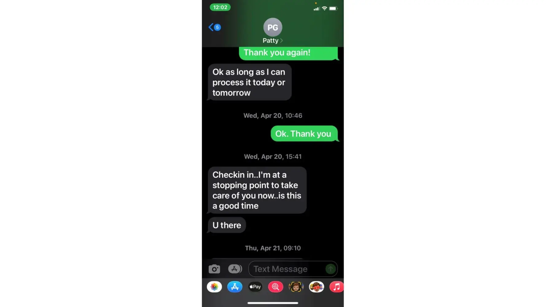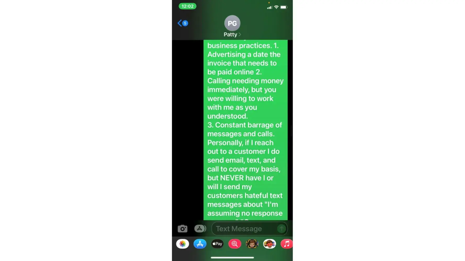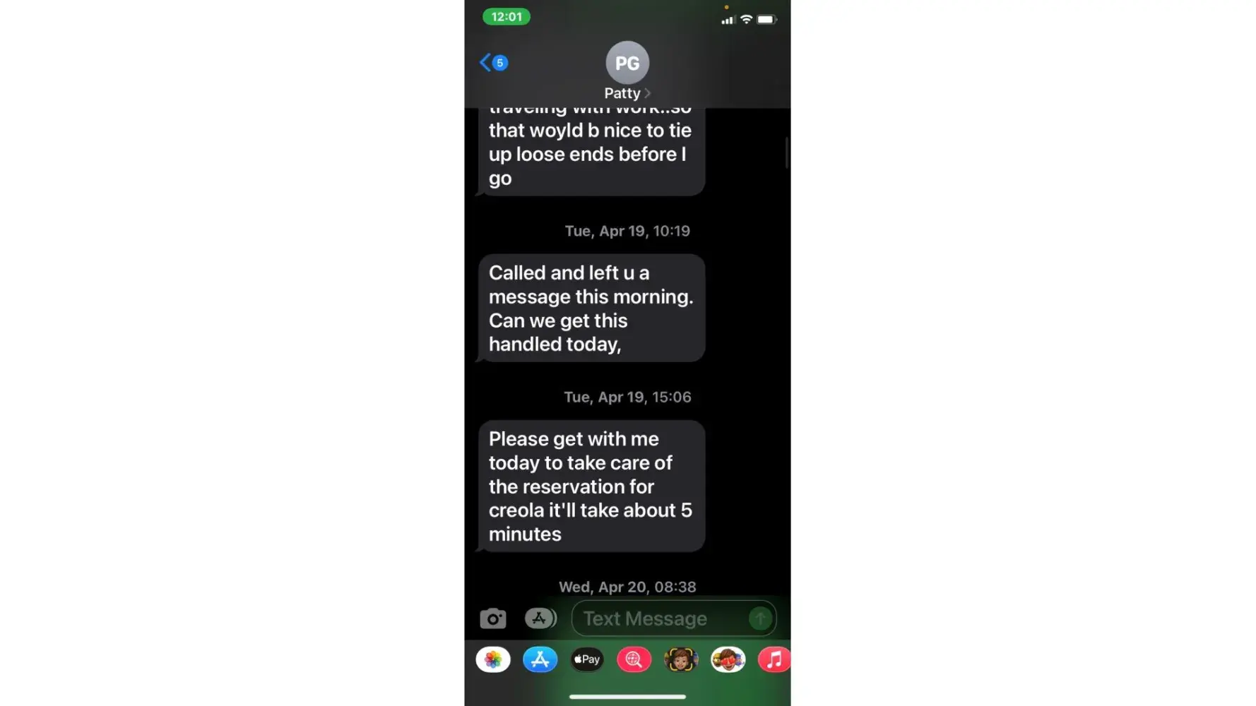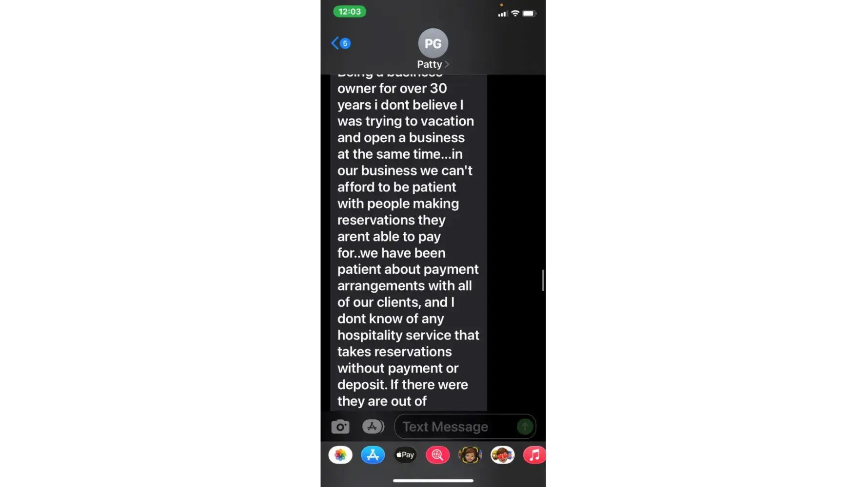 5. when she called 5/3 (the agreed upon date for payment) i was unable to take the call due to being at work. She then started texting me. "is the no response thing again meaning u arent able to make payment today or u dont know what to say? or meetings"