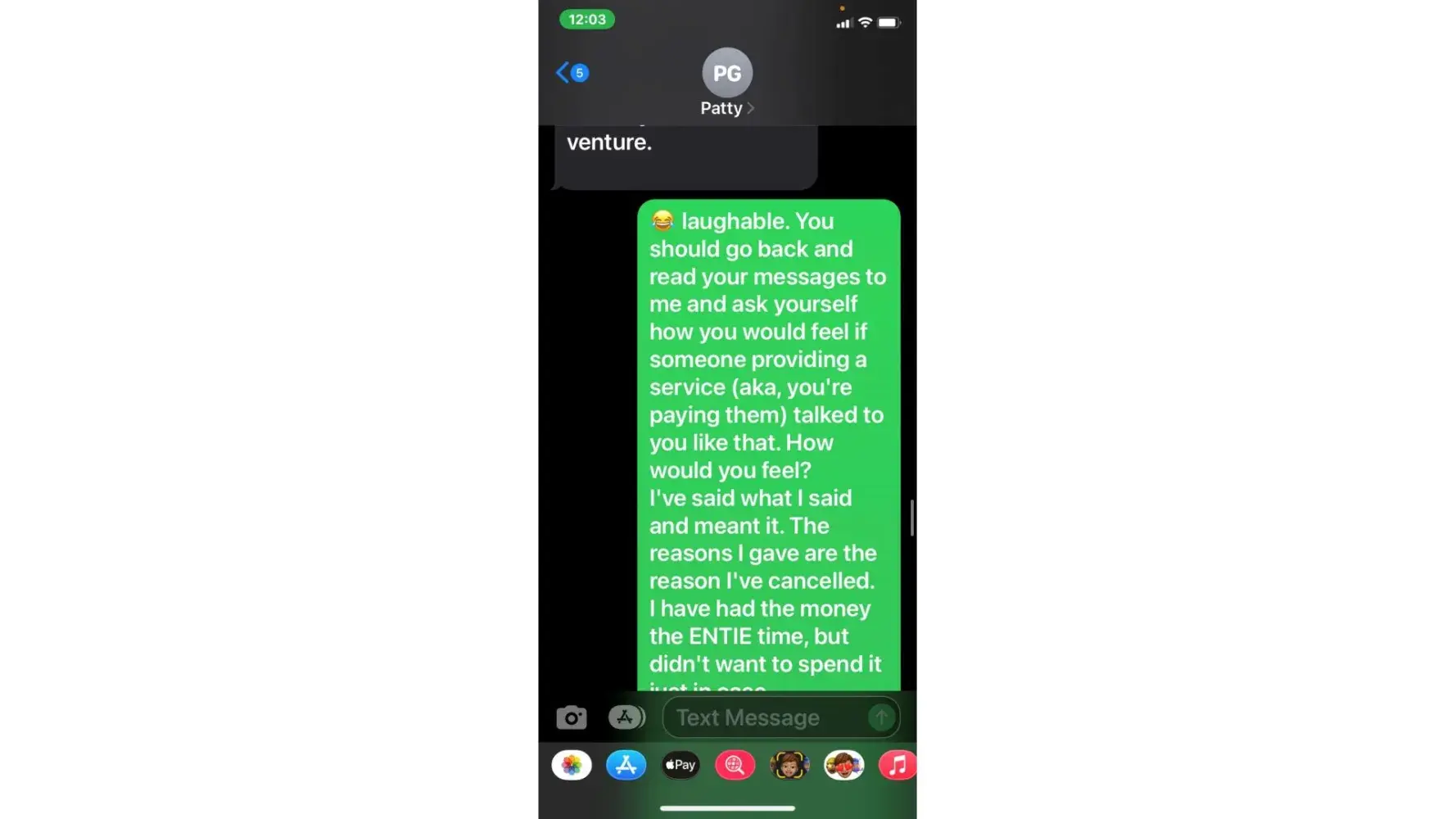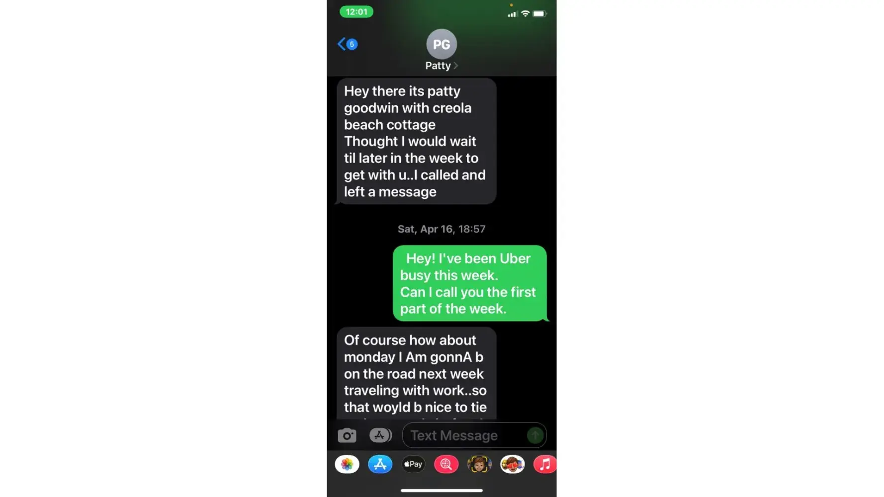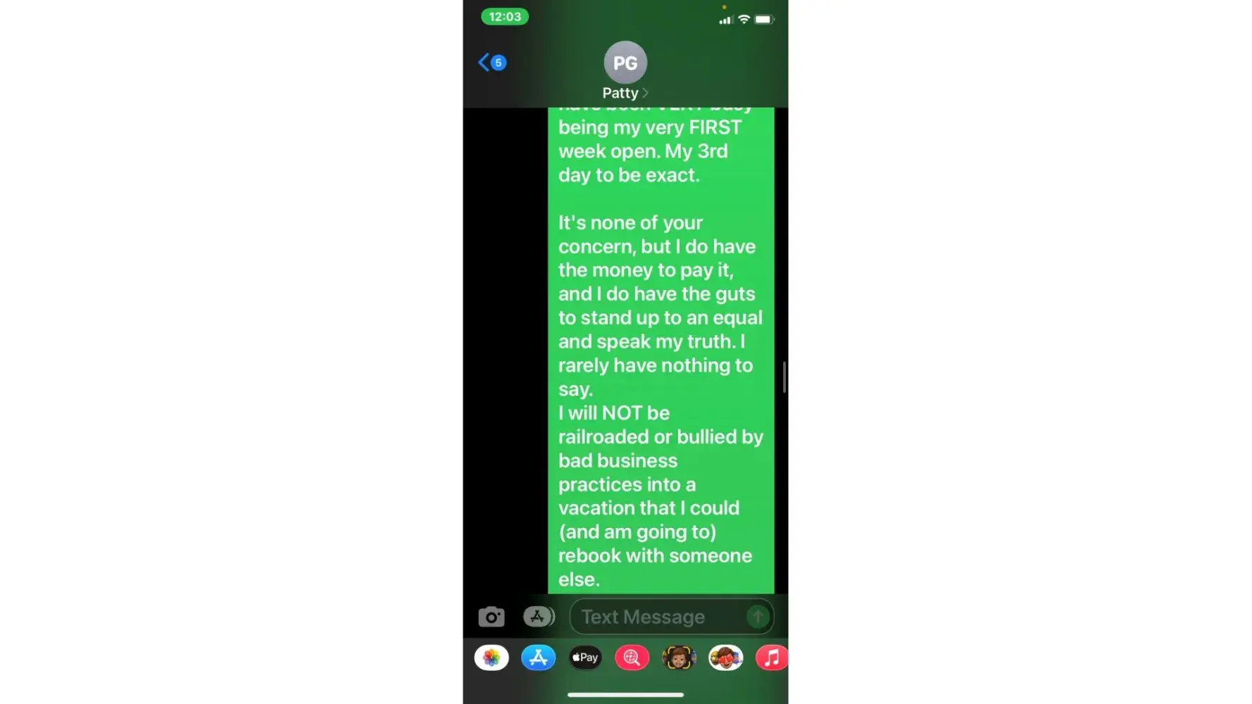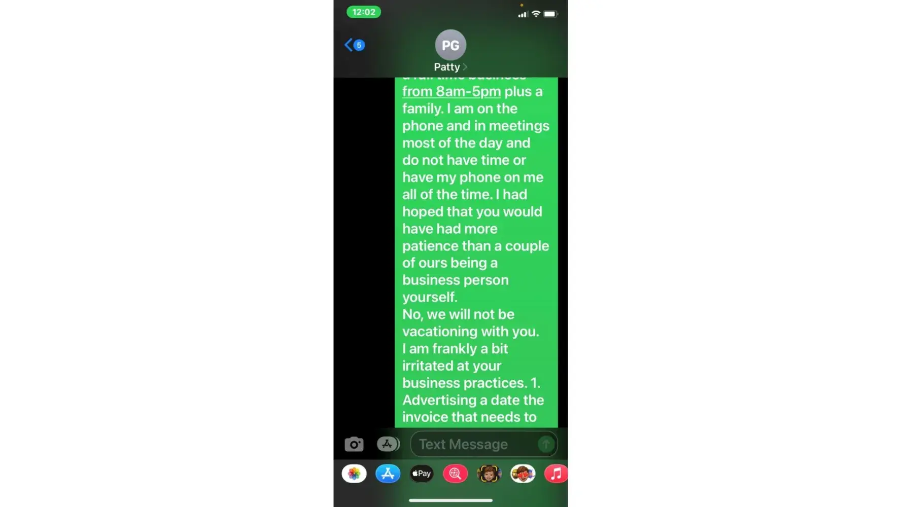 5. when she called 5/3 (the agreed upon date for payment) i was unable to take the call due to being at work. She then started texting me. "is the no response thing again meaning u arent able to make payment today or u dont know what to say? or meetings"