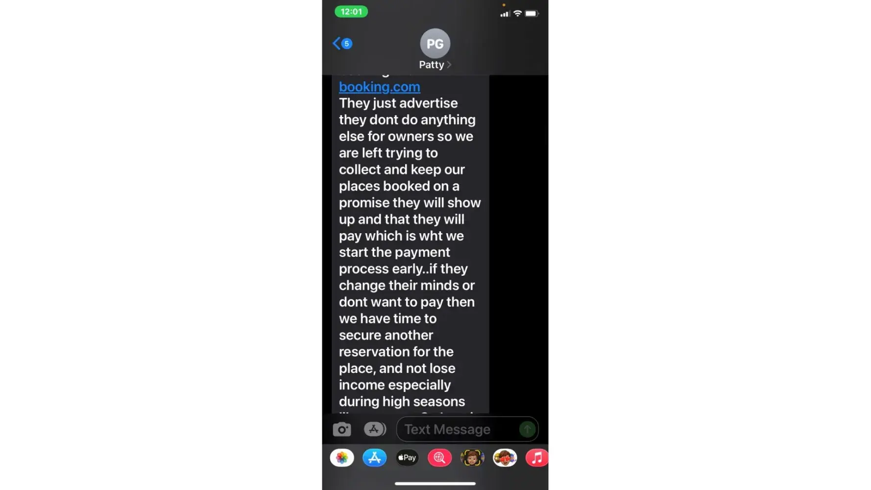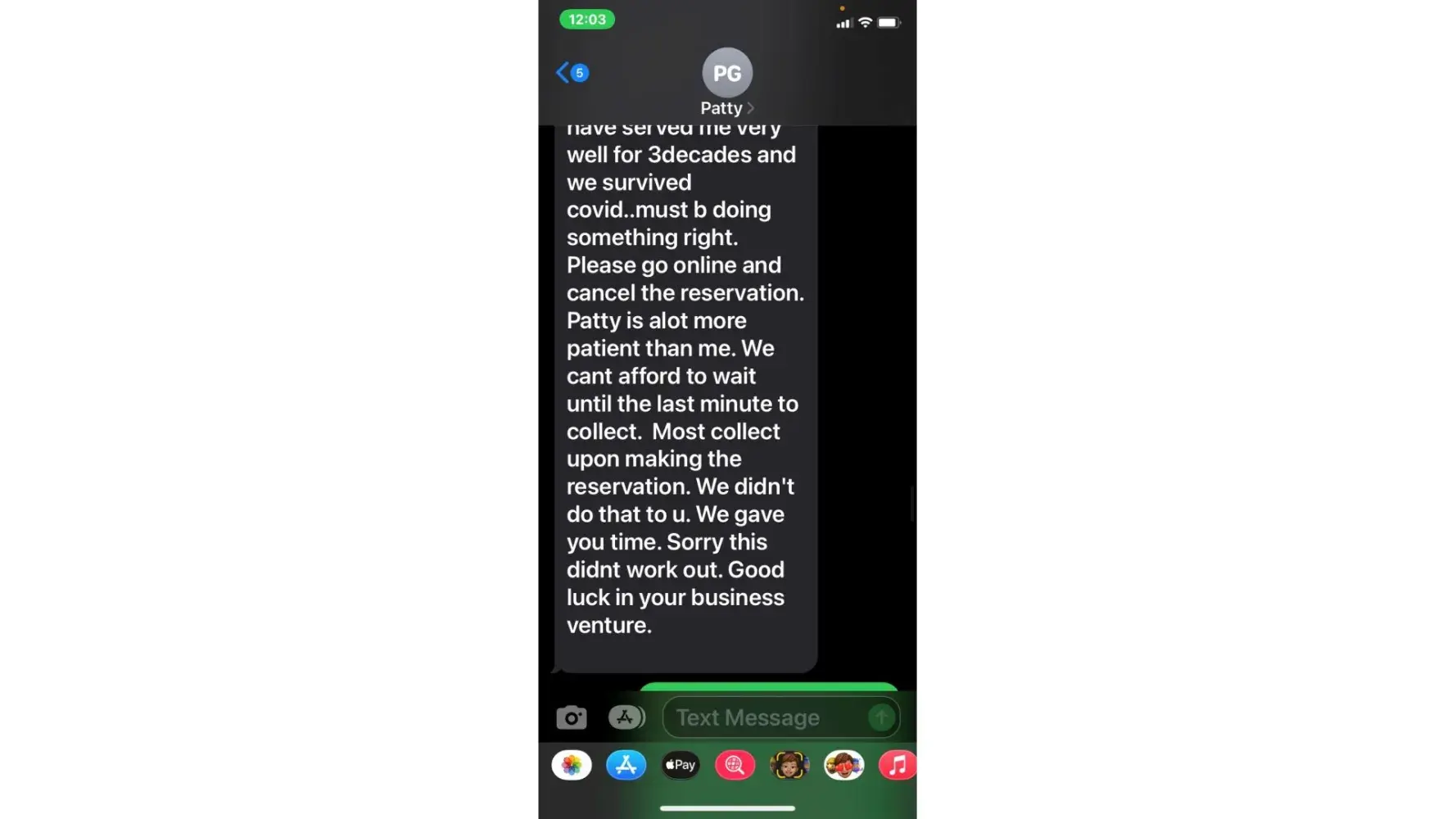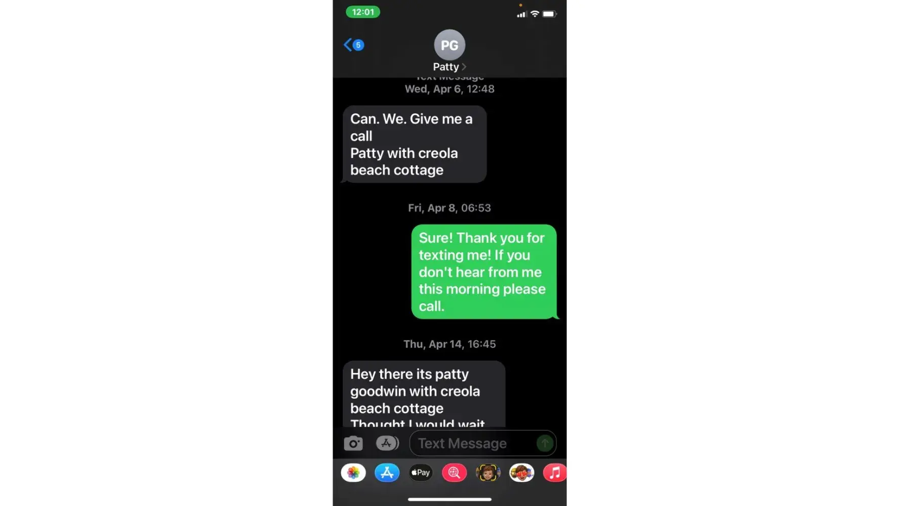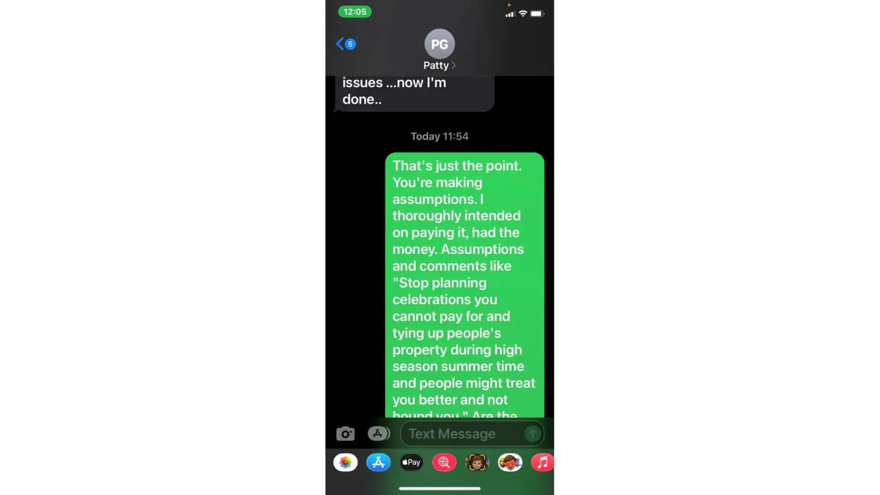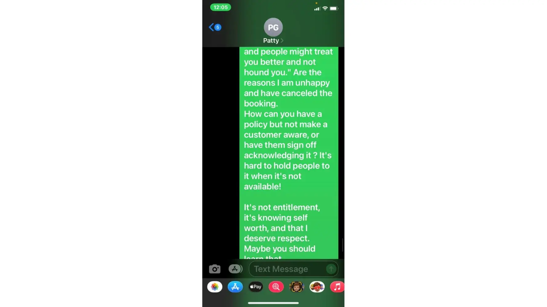 5. when she called 5/3 (the agreed upon date for payment) i was unable to take the call due to being at work. She then started texting me. "is the no response thing again meaning u arent able to make payment today or u dont know what to say? or meetings"