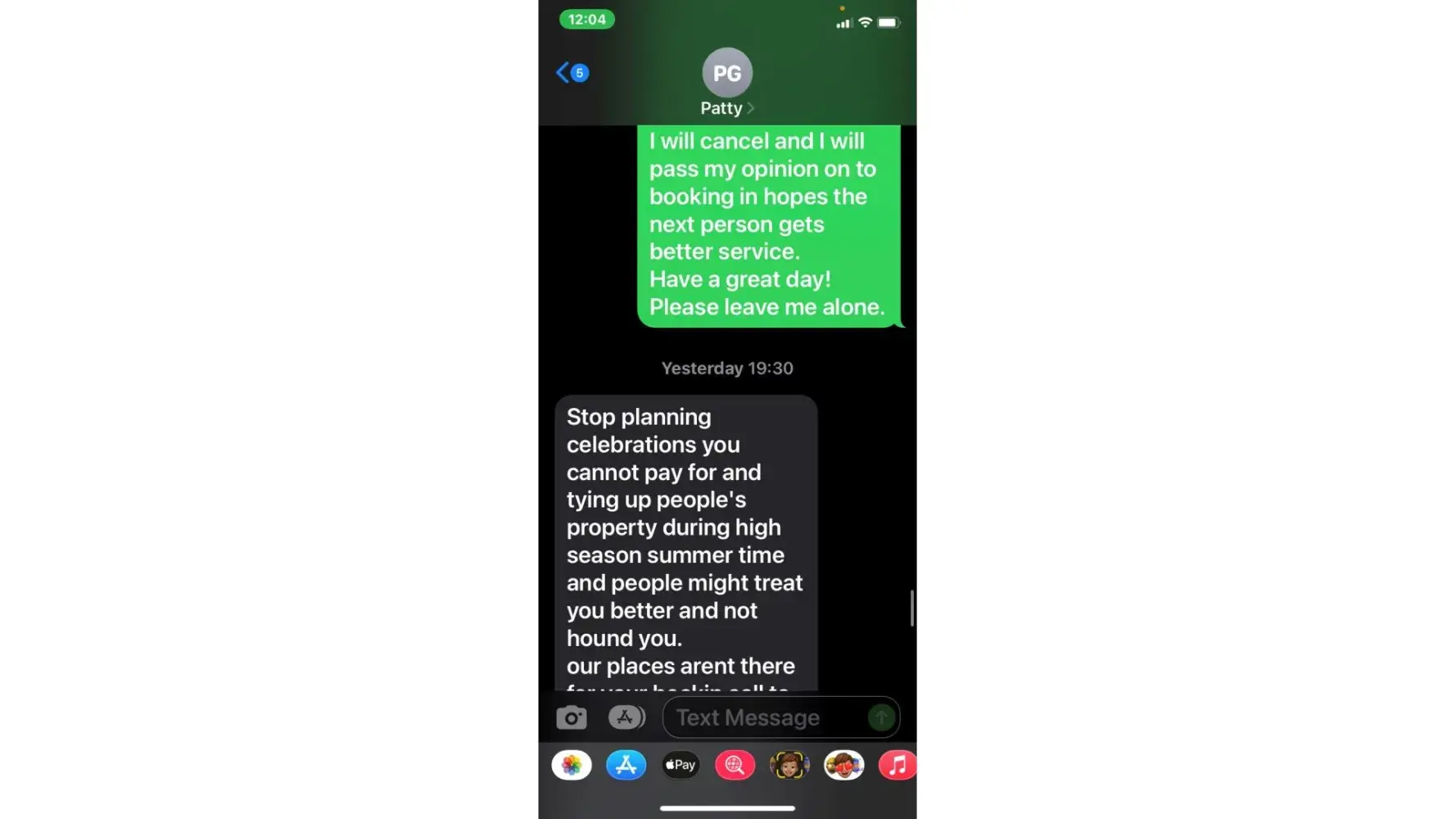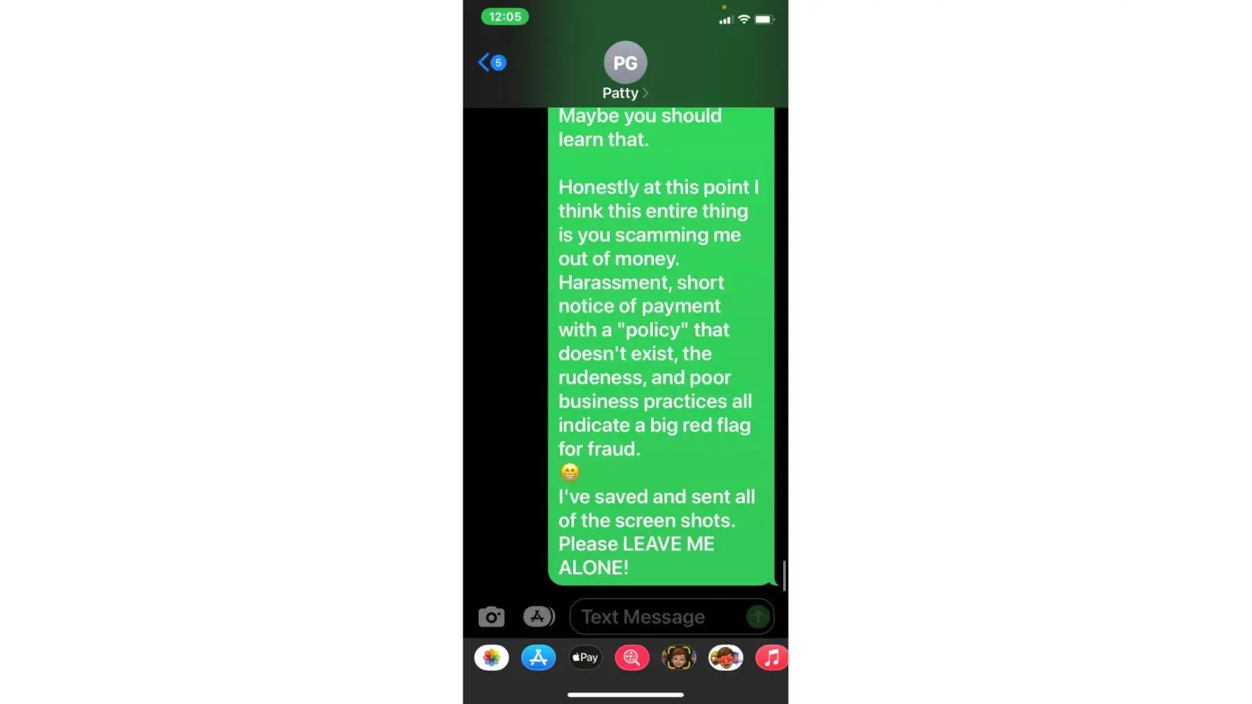 I later told them to leave me alone, because they kept sending harassing messages. They continued to send another one. In my next message i said "please leave me alone!" Still another message was sent.